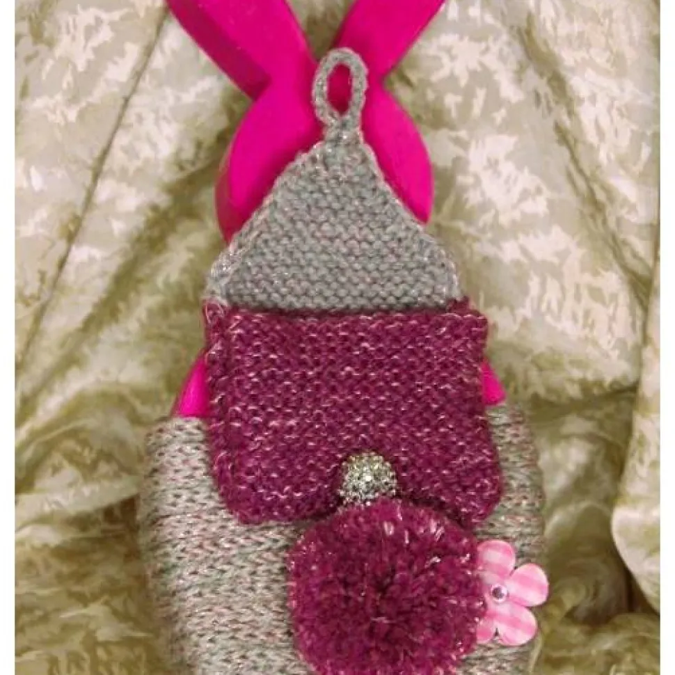 Auf der Rückseite des Hasen ist eine kleine, handgestrickte Tasche angebracht. Als Knopf dient hier eine herrlich glitzernde Perle. Hier kann man ein kleines Geschenk oder einen gefalteten Gutschein oder Brief verstecken (hat ungefähr Scheckkartengröße).