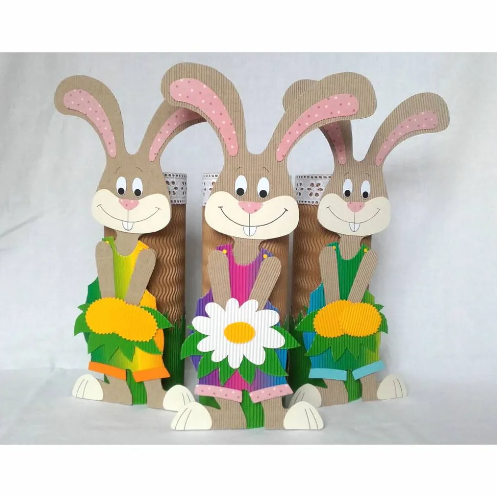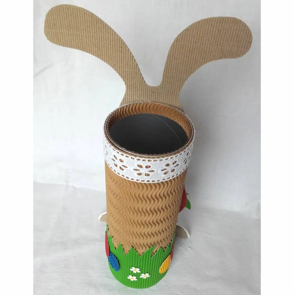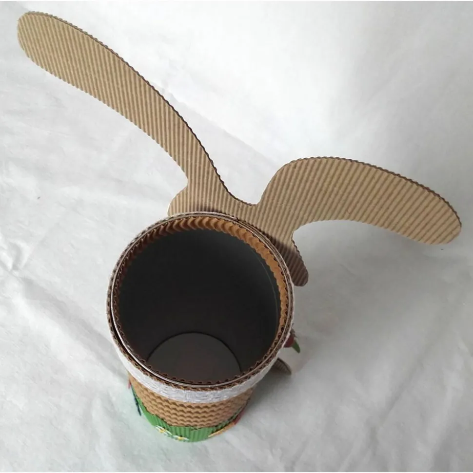 Der Hase ist sehr sorgfältig aus mehreren Lagen Wellpappe und Tonkarton gearbeitet.