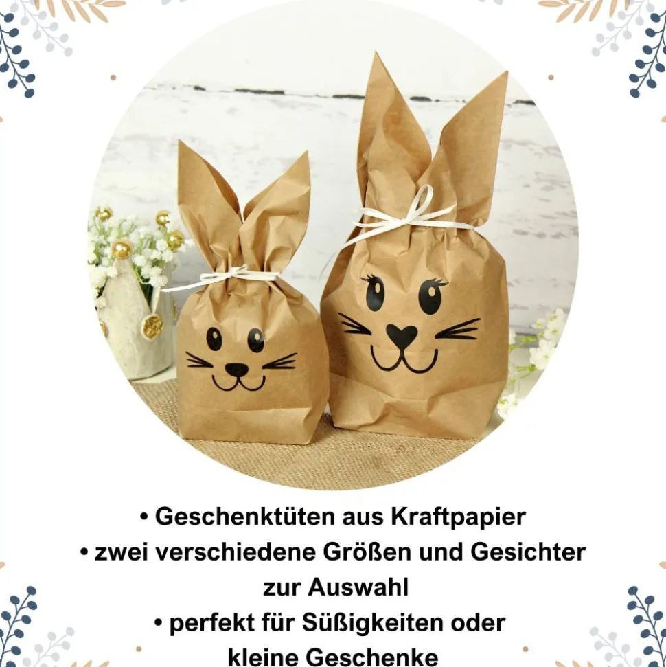 Diese zuckersüßen Geschenktüten aus Kraftpapier wurden in Form von niedlichen Häschen gestaltet. Ein Gesicht aus Folie verleiht ihnen einen charmanten Ausdruck, während im oberen Drittel der Tüten ‚Ohren‘ ausgeschnitten wurden. Sie werden mithilfe von Satinband verschlossen.