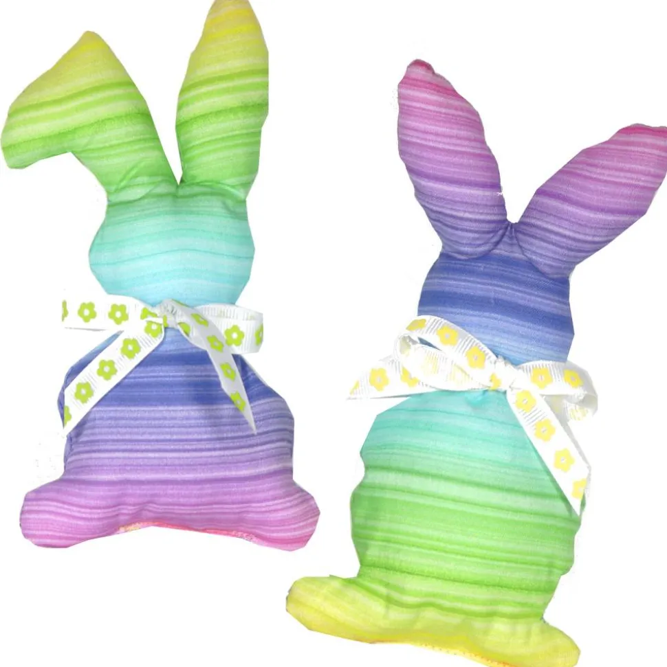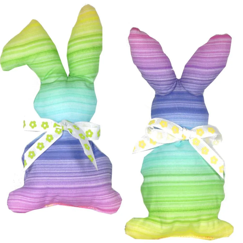 Diese beiden dekorativen Osterhasen sind aus hochwertigem 100% Baumwollstoff gefertigt und zeichnen sich durch ihren wunderschönen Farbverlauf in Regenbogenfarben aus. Jeder Hase trägt eine Stoffschleife mit zauberhaftem Blümchenmuster am Hals und ist sorgfältig mit weichen Silikonkugeln aus dünnen Polyesterfasern gefüllt. Die Maße betragen 16 cm hoch und unten 9 cm breit, wodurch sie sich vielseitig platzieren lassen.