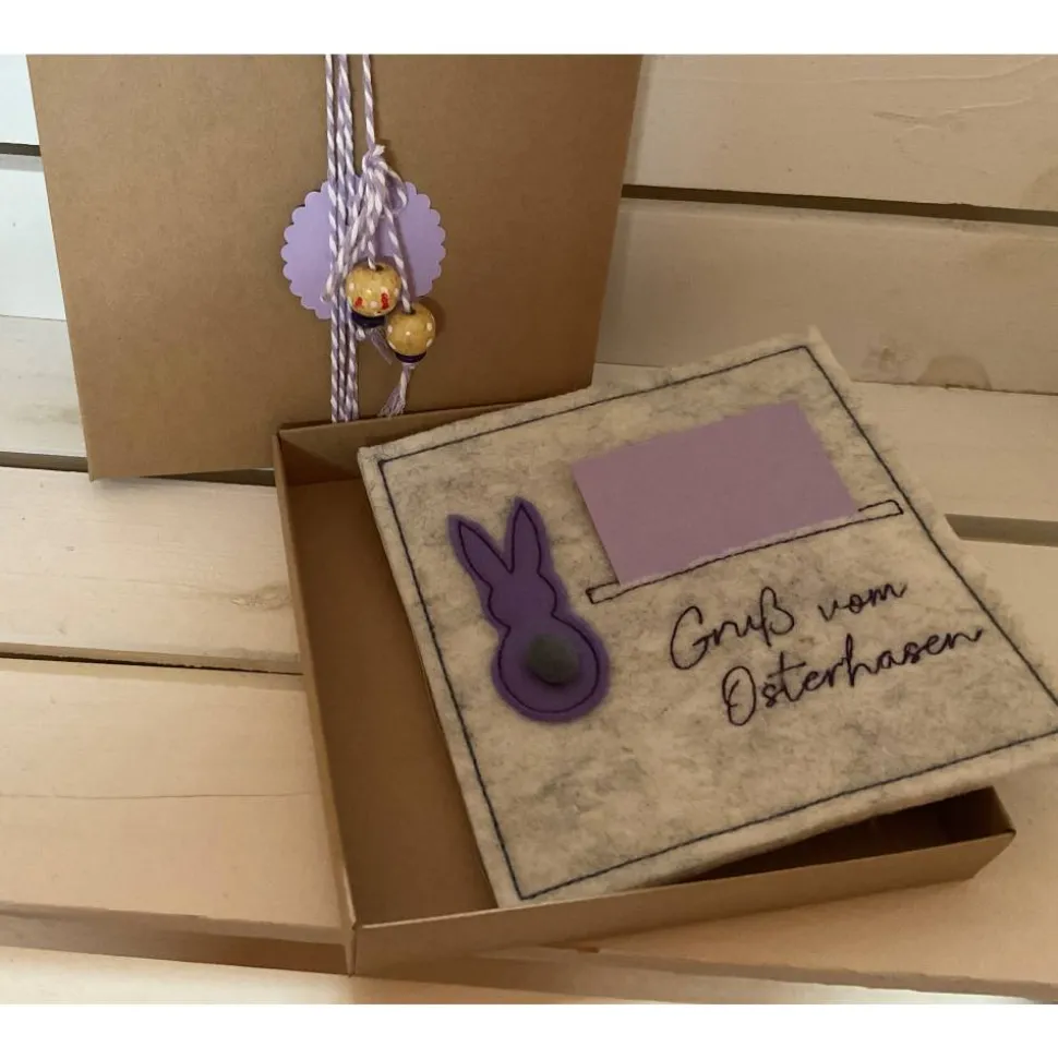 Im Inneren eine bestickte Filzkarte mit Einschub für Geld oder eine Botschaft, oder beides!