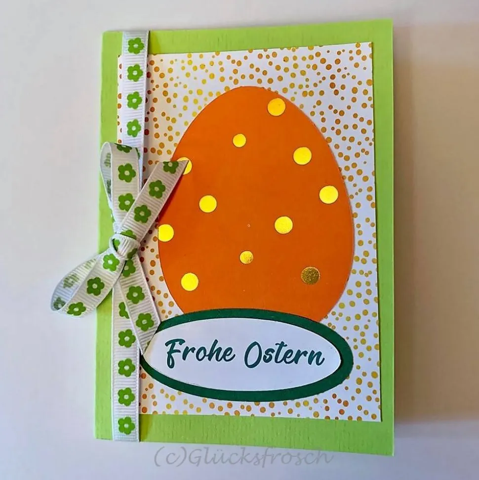 Auf der Vorderseite ist ein oranges Osterei mit goldfarbenen Punkten abgebildet. Ergänzt wird das Design durch eine weiße Schleife mit grünen Blümchen, die perfekt zum frischen Hintergrund passt.