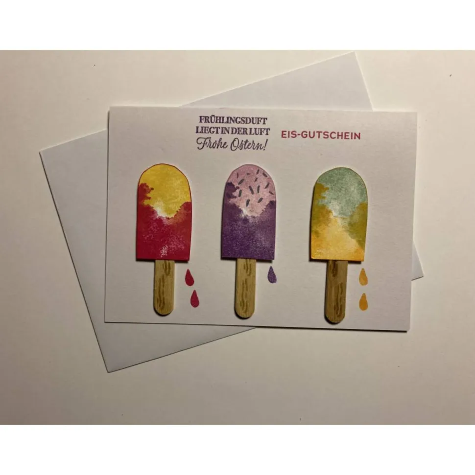 Diese Karten bestehen aus einer weißen Klappkarte mit Auflegern – Eis am Holzstiel.