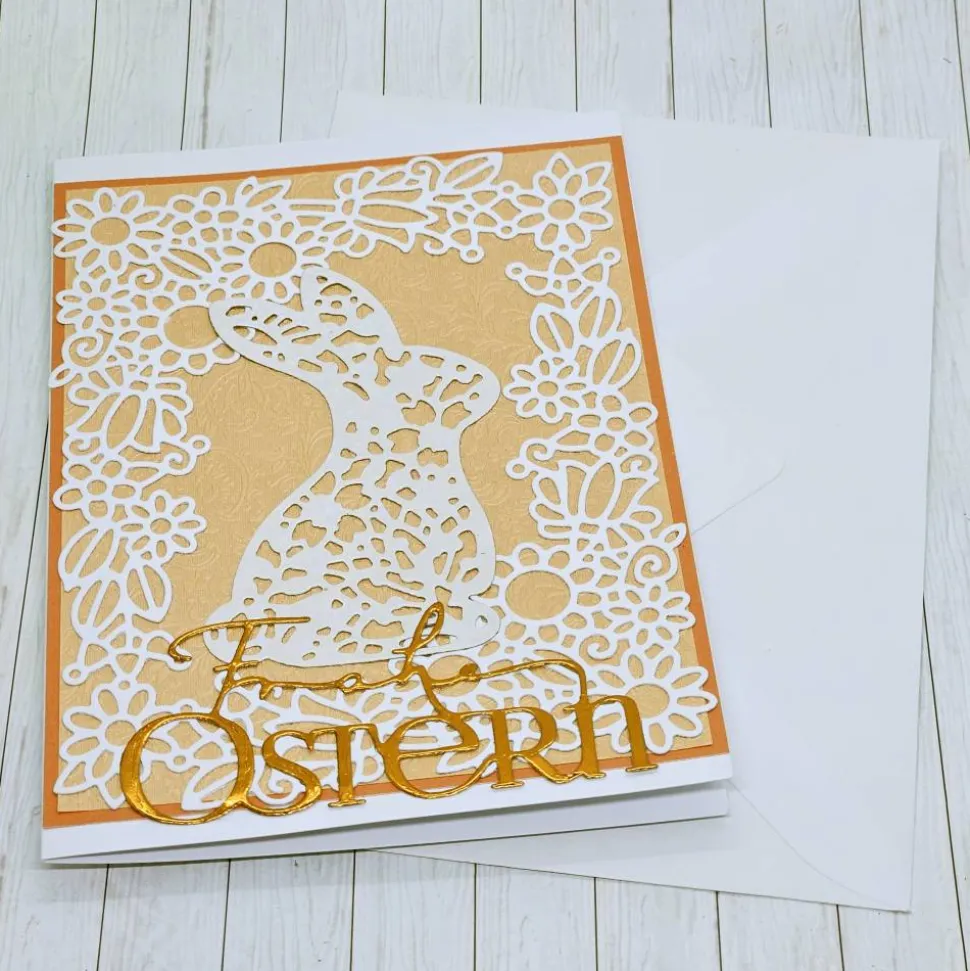 Der Hase präsentiert sich auf einem zarten weißen Blumenmuster vor einem orangefarbenen, geprägten Hintergrund. Die glänzende Aufschrift ergänzt das elegante Gesamtbild und macht die Karte zu einem echten Hingucker.