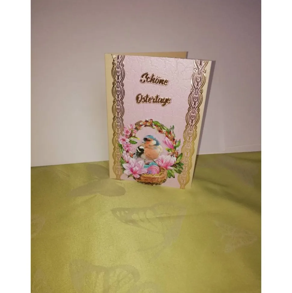 Verziert mit dem Stickerspruch: Schöne Ostertage und dem 3D Motiv Osterkorb mit Eiern und Blumen und einem kleinen Singvogel.