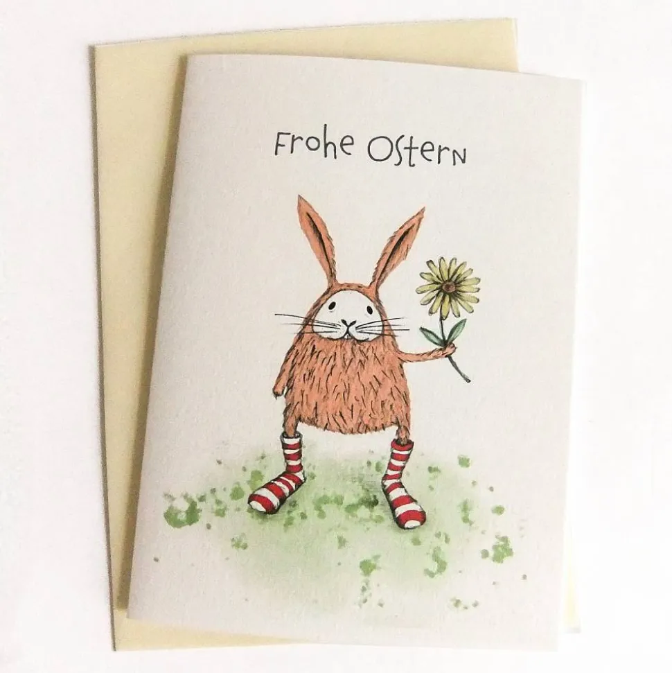 Hase in geringelten Socken mit Schriftzug ‚Frohe Ostern‘
