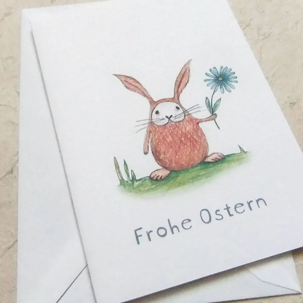Die Karte wurde von mir entworfen. Der Hase analog mit Bleistift gezeichnet, eingescannt, digital coloriert, für den Druck vorbereitet, auf festem säurefreiem Zeichenpapier (200g/qm) ausgedruckt und mittig zur Karte gefaltet.