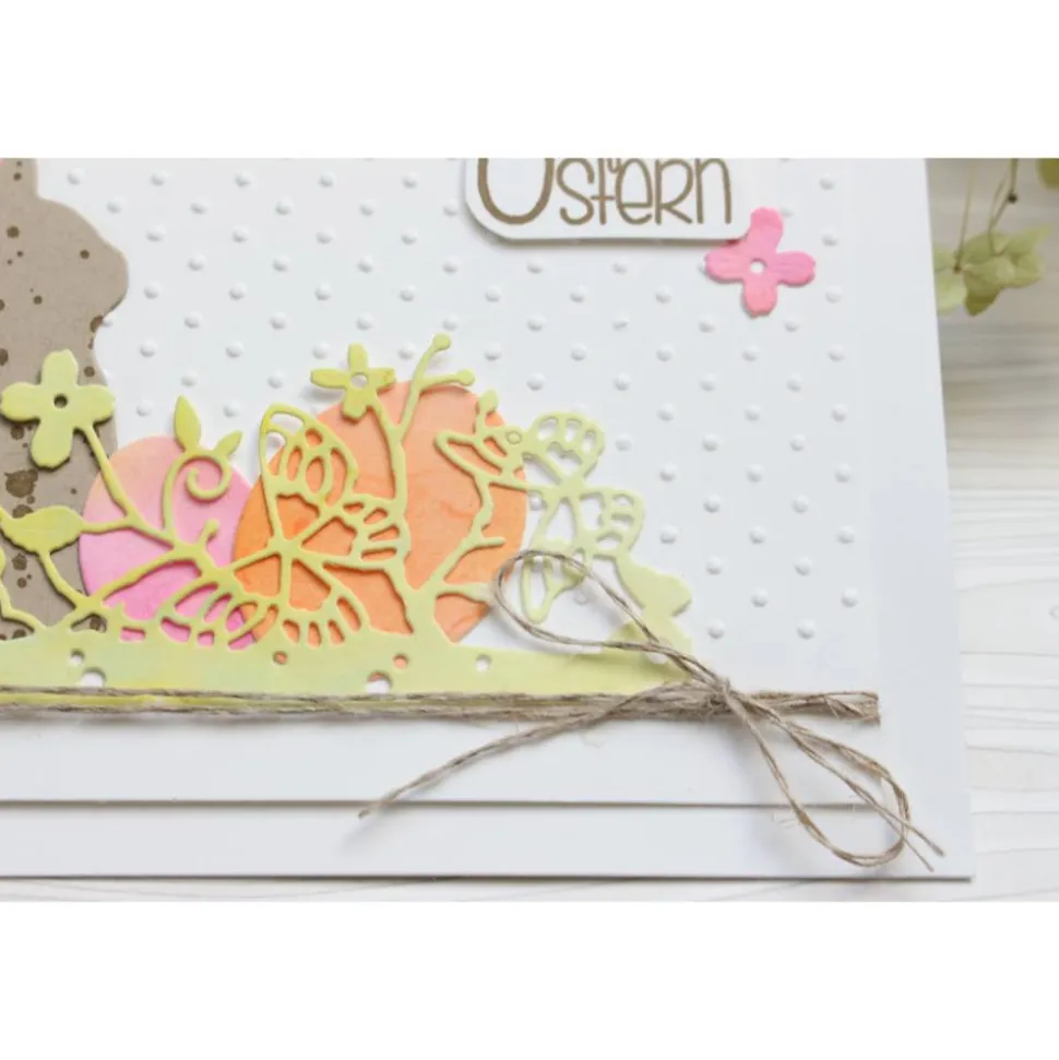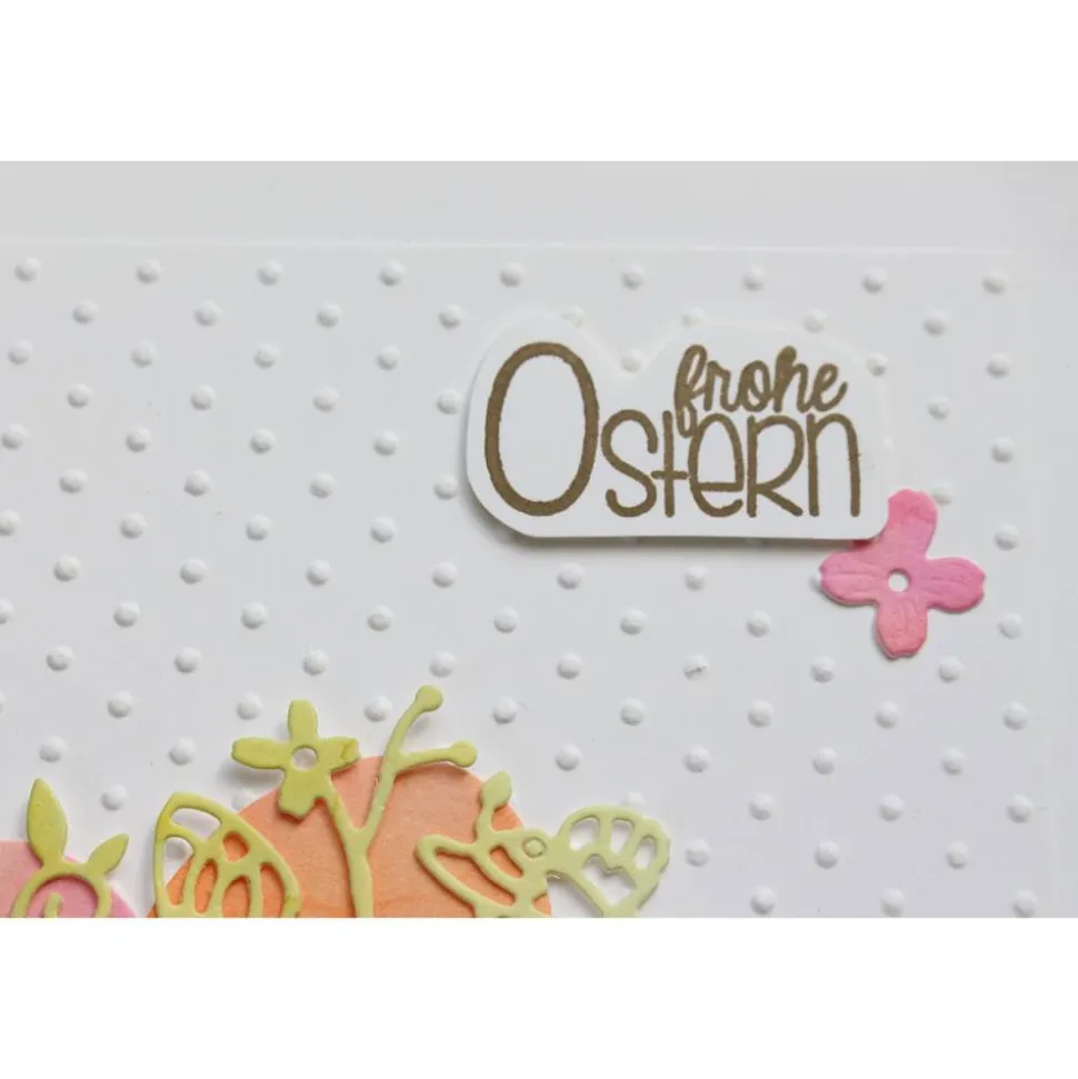 Den Schriftzug „Frohe Ostern“ habe ich gestempelt, ausgeschnitten und mit Abstandspads aufgeklebt.
