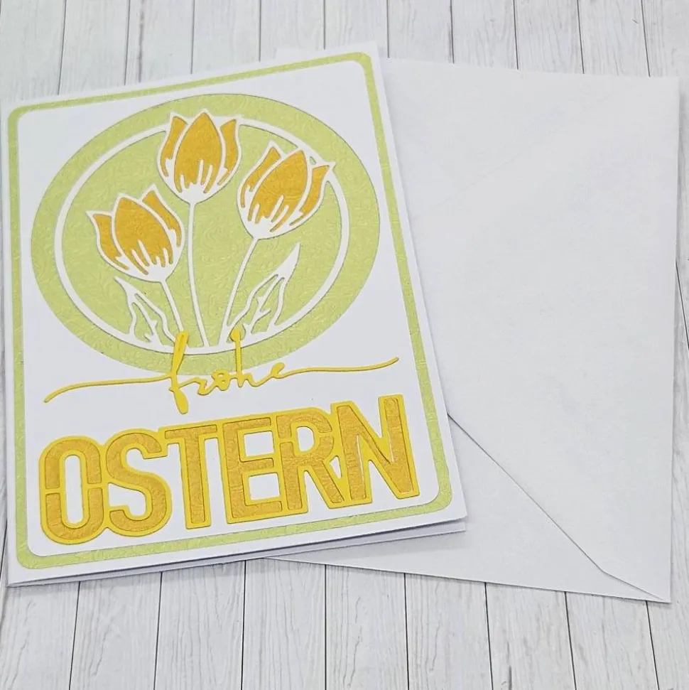 Osterkarte Tulpen gelb – Deine besondere Grußkarte für Ostern und den Frühling! Genieße nach dem langen Herbst und Winter die frischen Farben der Jahreszeit. Diese liebevoll gestaltete Karte begeistert mit zarten Tulpenmotiven in Gelb, gefüllt mit Papier mit Perlmutteffekt. Der grüne Hintergrund ist mit einem zarten floralen geprägten Muster versehen und glänzt je nach Lichteinfall edel.