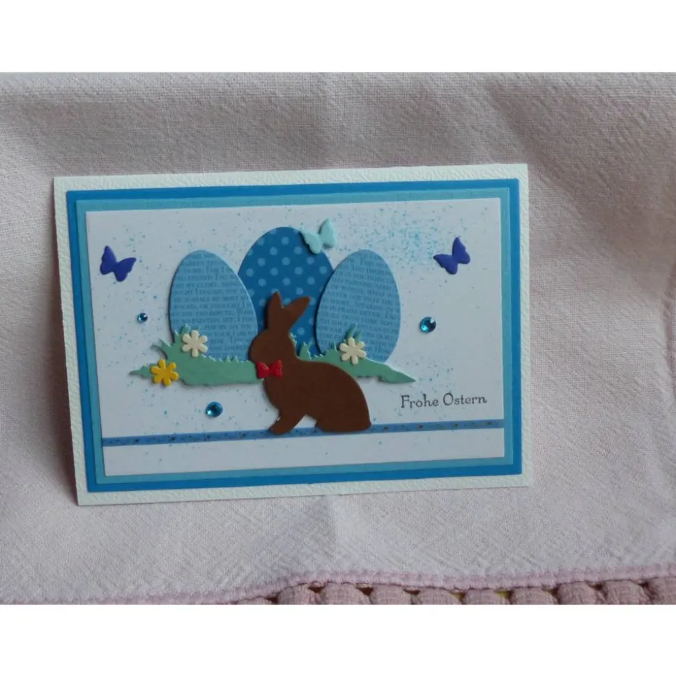 verziert ist die Karte mit Eiern,Hasen und Schmetterlinge,Blumen,Strsssteinchen