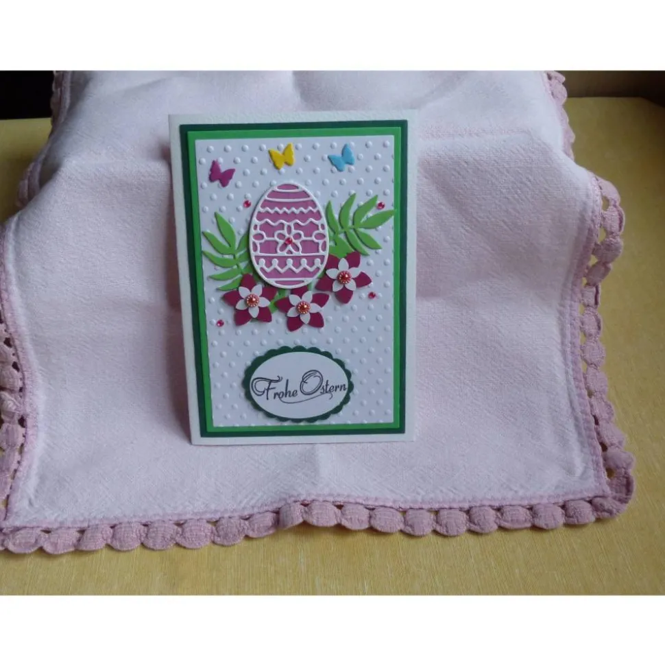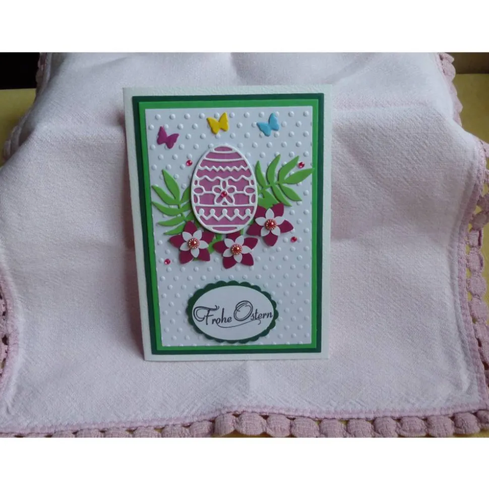 verziert ist die Karte mit Zweigen,Blumen,Schmetterlinge,Ei,Straßsteinchen
