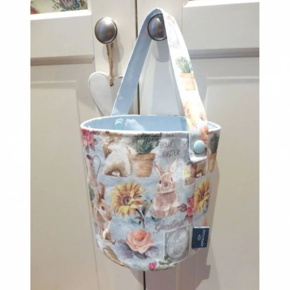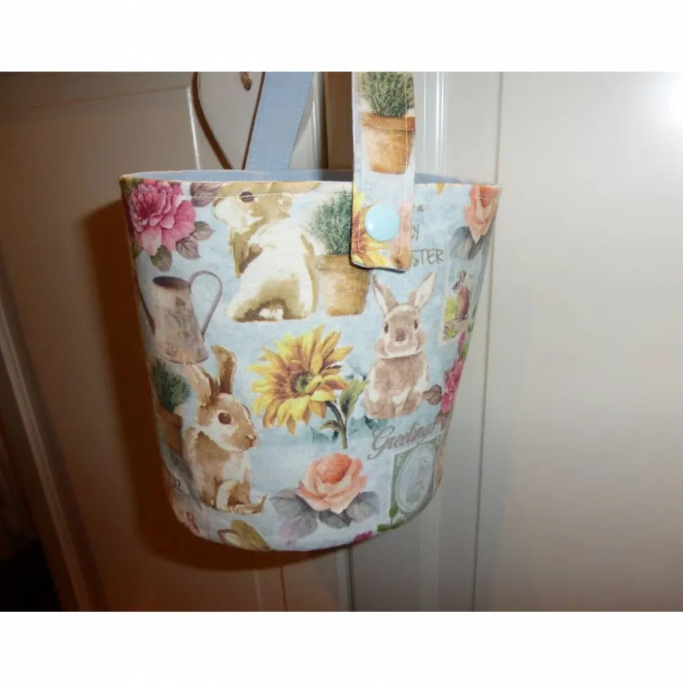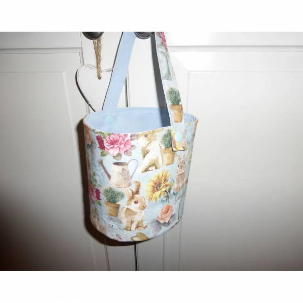 Wunderschöner Stoff mit Hasen, Blumen, Lavendel und Gießkanne wurde hier zu einem Osterkörbchen vernäht.