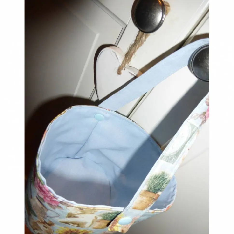 Da das Körbchen abnehmbare Henkel hat (sie sind mit Druckknöpfen befestigt), kann es auch als Utensilo nach Ostern genutzt werden-auch beidseitig, da keine Naht zu sehen ist.