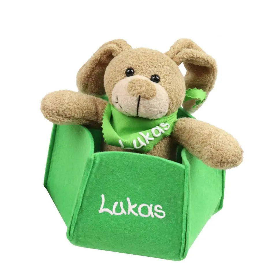 Ein tolles Ostergeschenk für große und kleine Kinder. Ein Osternest zum Befüllen und ein niedlicher Hase, der genauso wie das Filzkörbchen mit dem Namen des Kindes beschriftet wird.