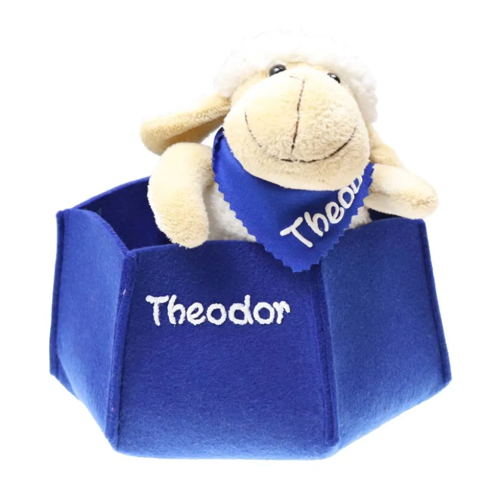 Ein tolles Ostergeschenk für große und kleine Kinder. Ein Osternest zum Befüllen und ein niedliches Schaf, der genauso wie das Filzkörbchen mit dem Namen des Kindes beschriftet wird.
