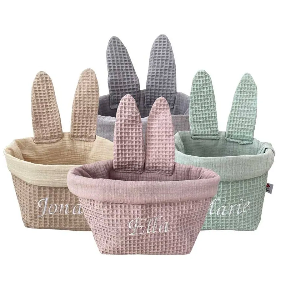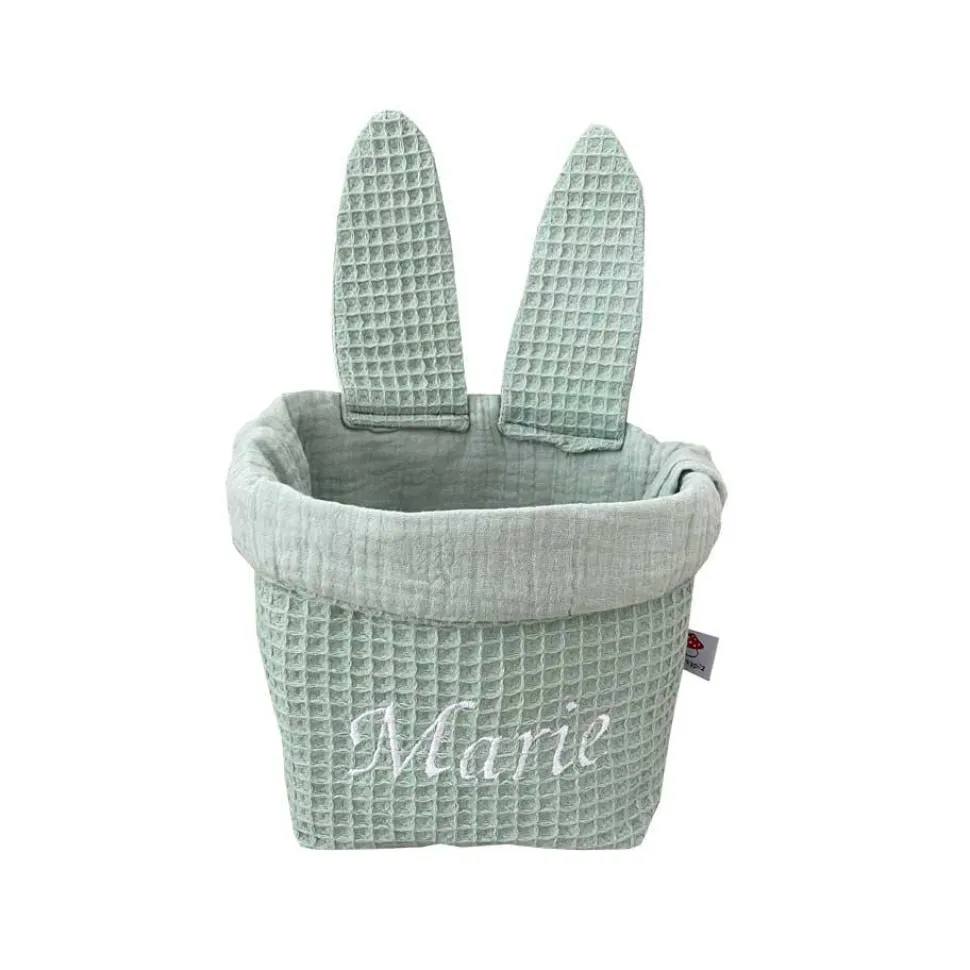 Unser Osterkörbchen “Hase” aus Waffelpique ist nicht nur wunderschön, sondern auch sehr praktisch. Es kann als Dekoration zu Ostern genutzt werden und im Alltag ist es ein kleiner Helfer, der im Bad oder auf dem Wickeltisch idealen Einsatz zum Verstauen von Kleinigkeiten bietet. Der besondere Clou ist natürlich, dass wir Ihren Wunschnamen auf das Utensilo sticken.