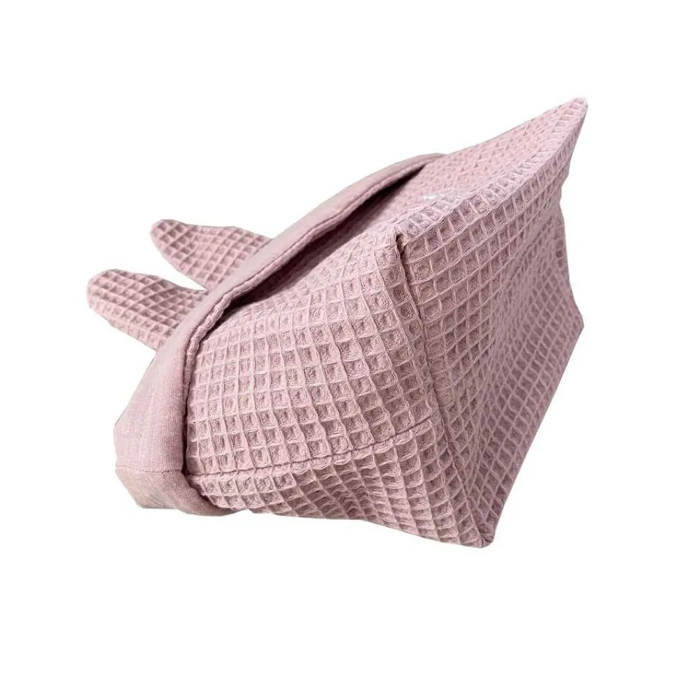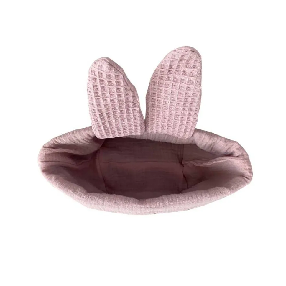 Das Körbchen ist außen aus Waffelpique gearbeitet und mit farblich passendem Musselin abgefüttert. Für genug Standfestigkeit sorgt der eingearbeitete Boden und Vlieseline. Das Utensilo mit Hasenohren ist im umgeklappten Zustand ca 29 cm breit und 13 cm hoch (ohne Ohren und Boden).
