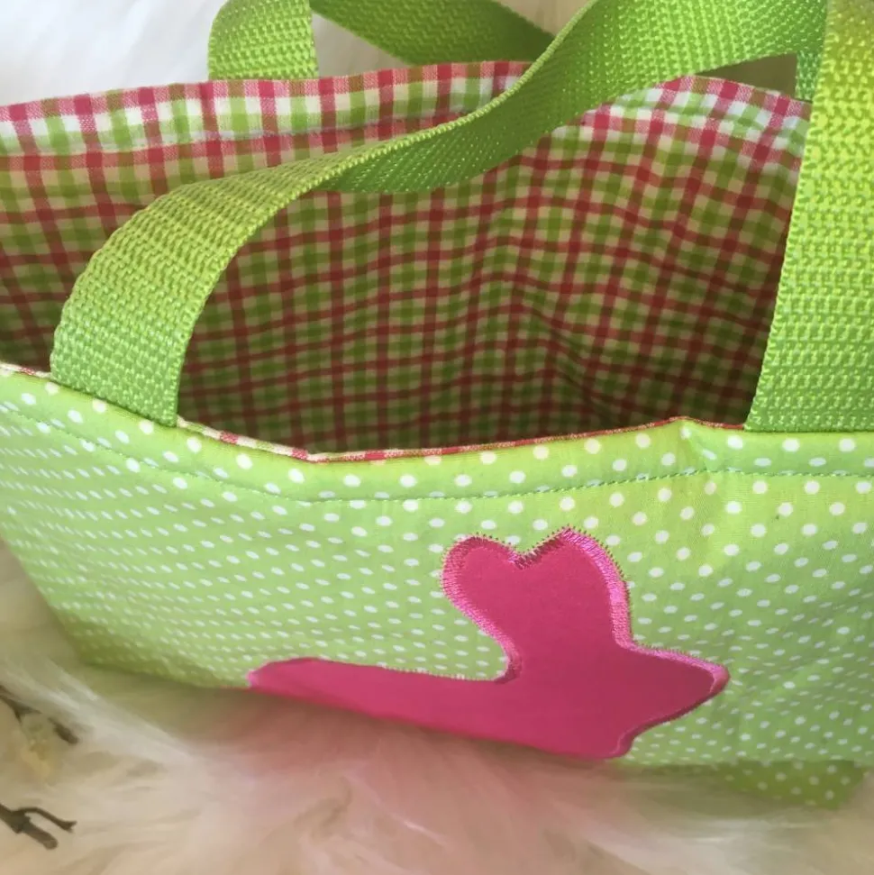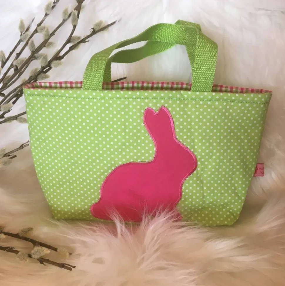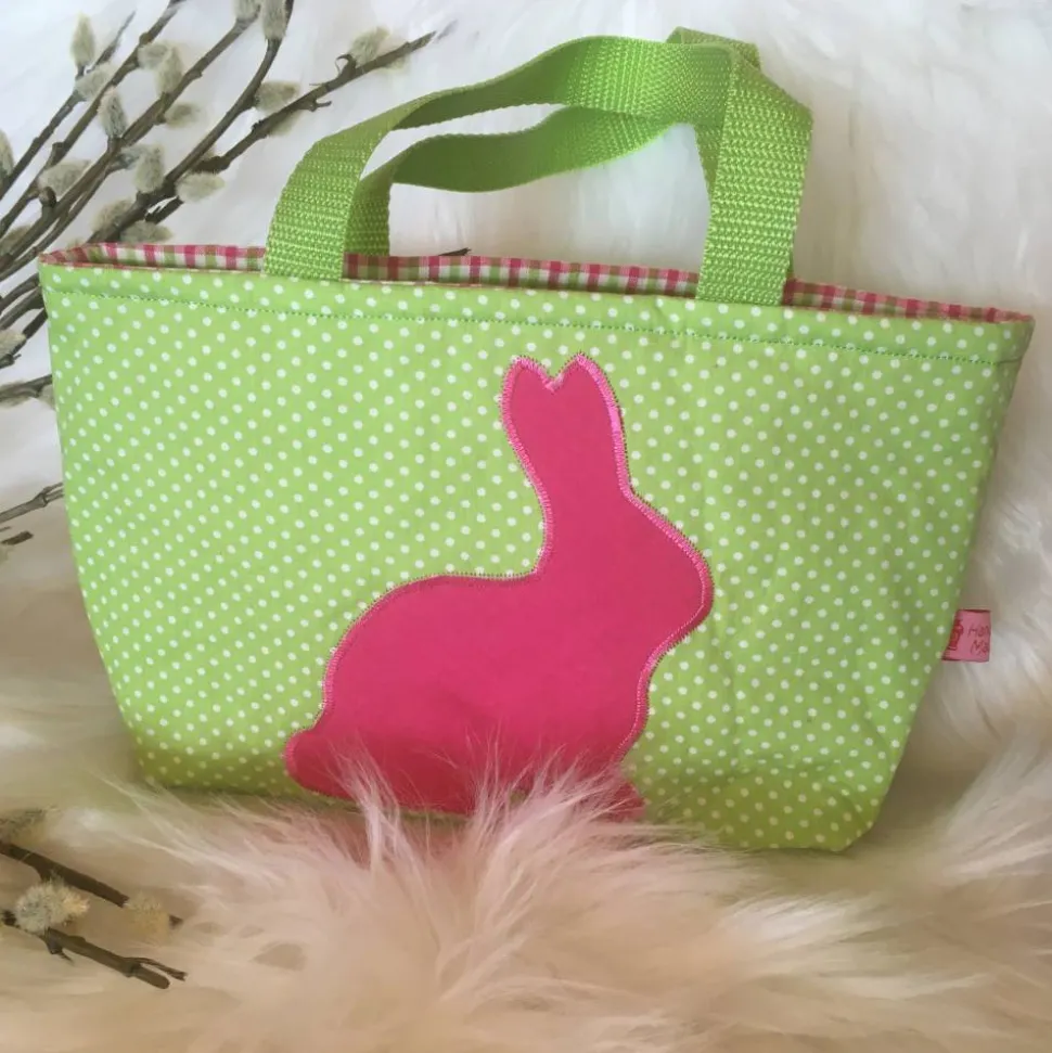 Verziert wurde das Ostertäschchen mit einer Applikation aus pinkfarbenem Stoff in Form eines Osterhasen.