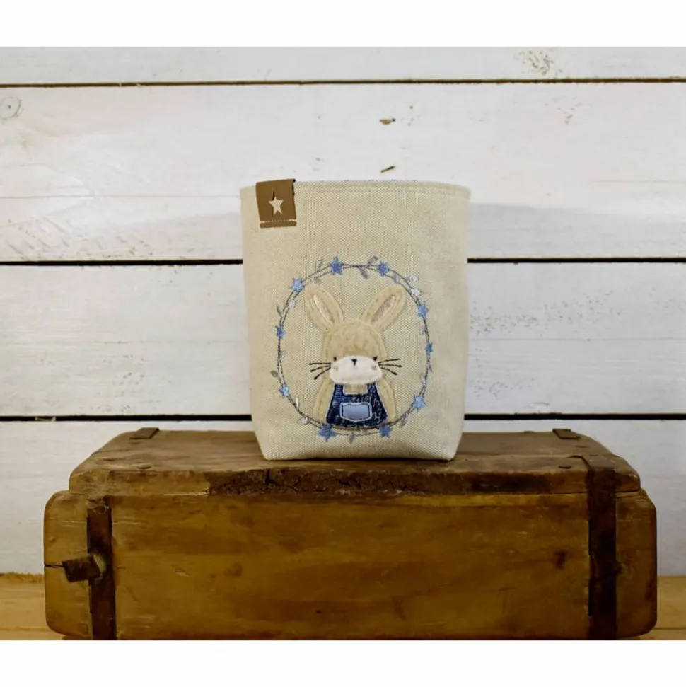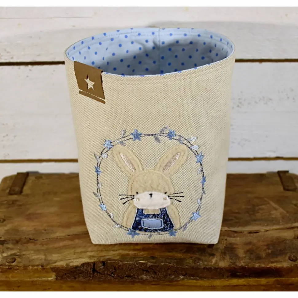 beigefarbener Osterkorb mit einer zauberhaften Hasenstickerei, in Blau/Grau gehalten. Geschmakvoll dekorieren in der Frühjahr- / Osterzeit, passend für viele Einrichtungsstile