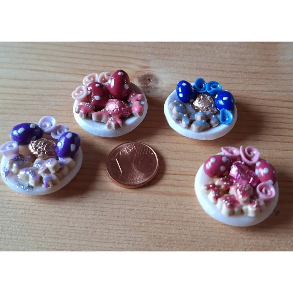 Entdecke handgemachte bunte Osterteller als bezauberndes Puppenstubenzubehör für deine Wichtelwelt! An Ostern verteilen kleine Wichtel überall bunte, gemischte Eier – auf liebevoll gestalteten Tellerchen. Die kleinen bunten Schokoladen sind fest montiert und jede Zusammenstellung ist ein absolutes Einzelstück. So bekommst du immer eine einzigartige Miniatur, die sich in Farbe und Größe leicht unterscheidet.