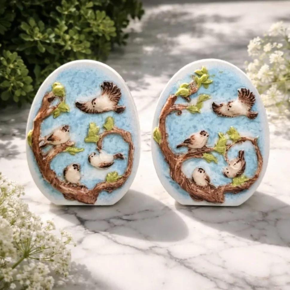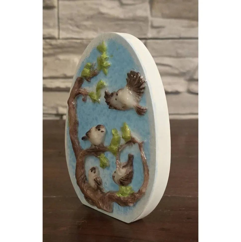 Osterei Aufsteller mit einem Motiv das Spatzen auf dem Baum zeigt.