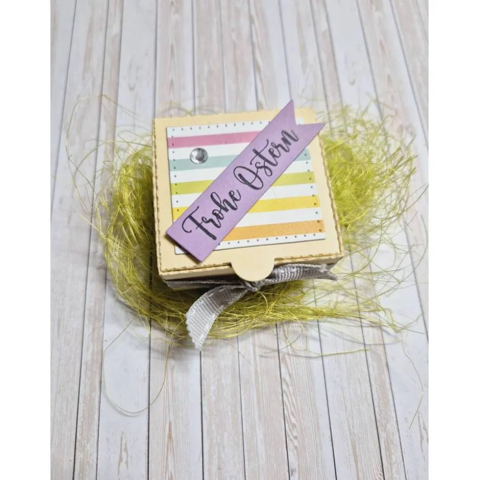 Verpacke ein schönes Teelicht in dieser zauberhaften Geschenkbox im österlichen Design. Die Box ist aus stabilem Farbkarton in hellgelb ausgestanzt und gefaltet. Ein grau-weißes Band rundet das liebevolle Design ab und die Dekoration ist typisch österlich gehalten.