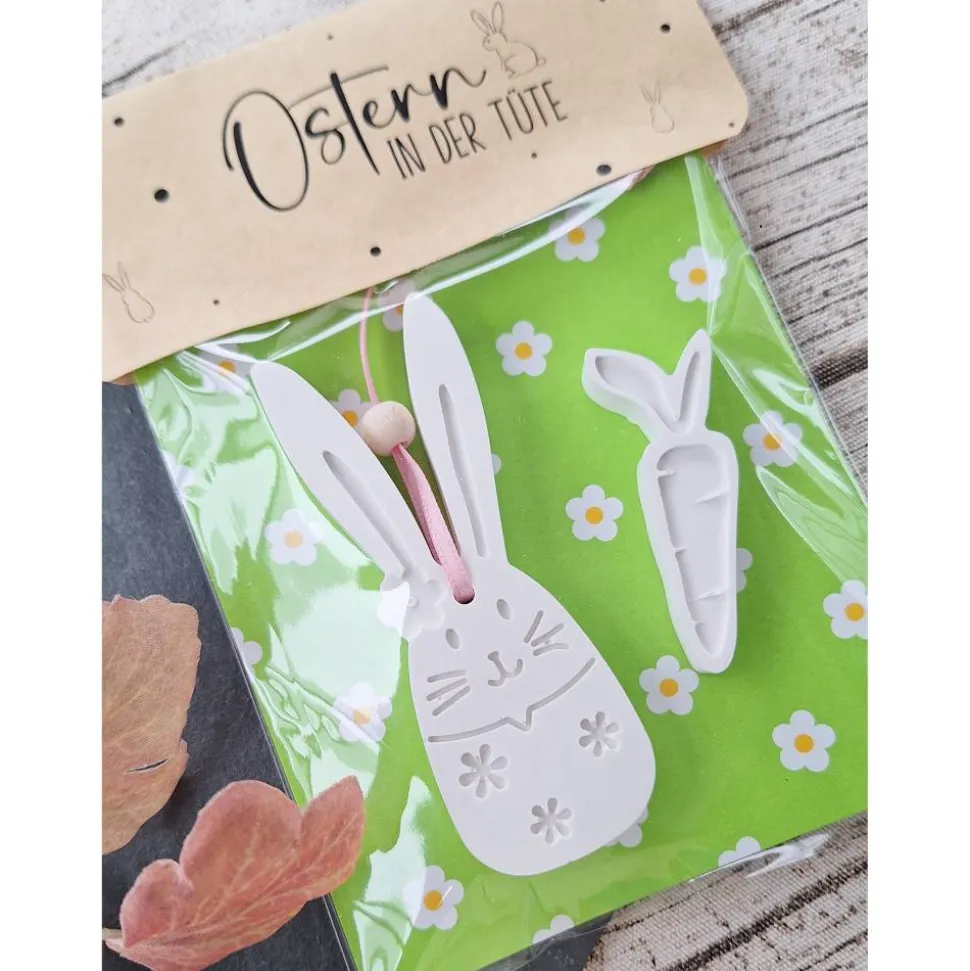 Das Tütchen enthält einen Hasenanhänger mit kleiner Holzperle und einer Deko Möhre, zusammen liebevoll verpackt.