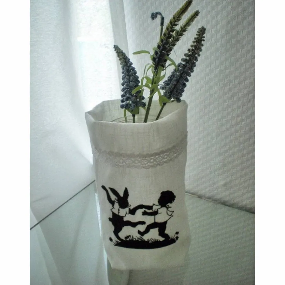 Ostern Lichtbeutel Geschenkbeutel Tischdeko Vasenhuse Hasentanz GESTICKT Leinen Scherenschnitt Spitze.