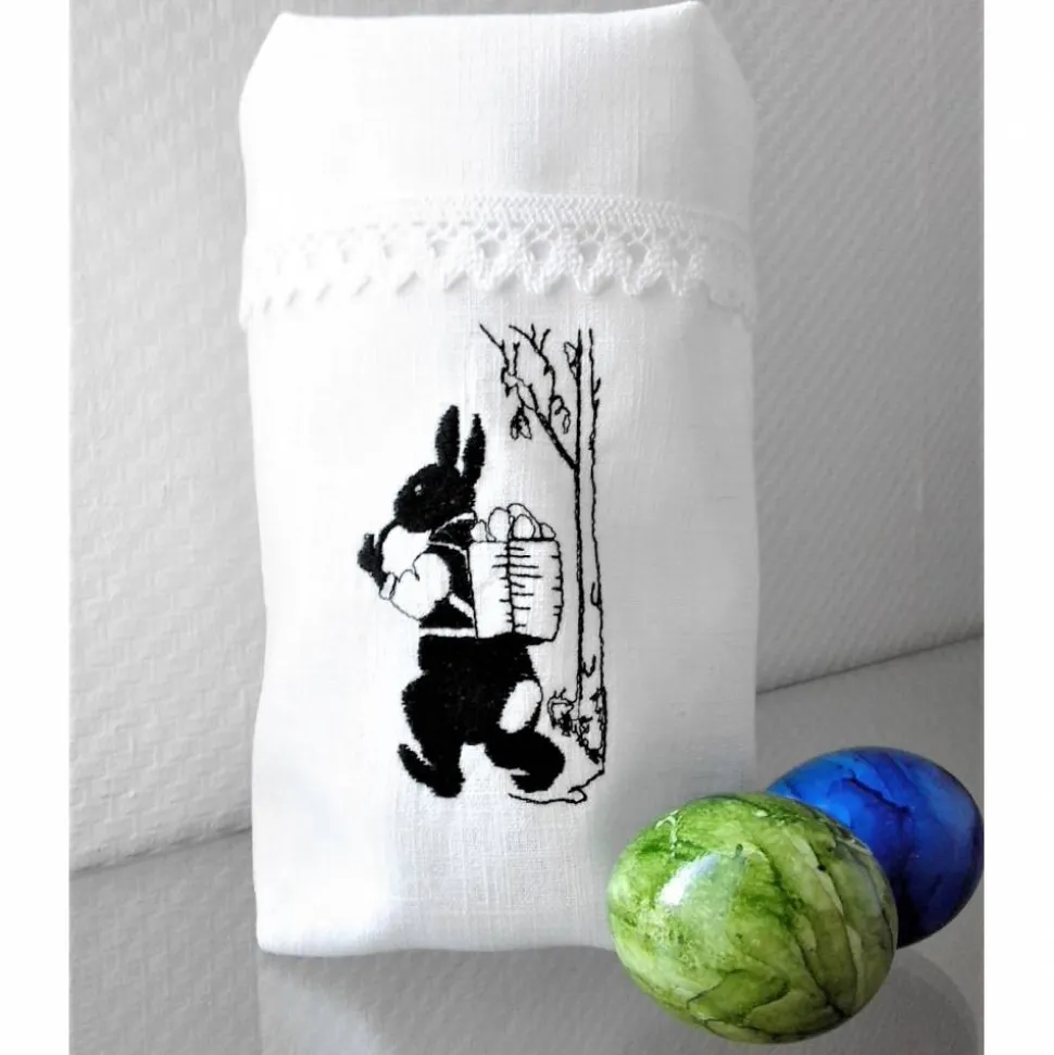 Der Lichtbeutel besteht aus 100% Leinen. Mit Baumwollspitze und bestickt mit einem Motiv von FeinKram ist der Beutel sehr edel.
