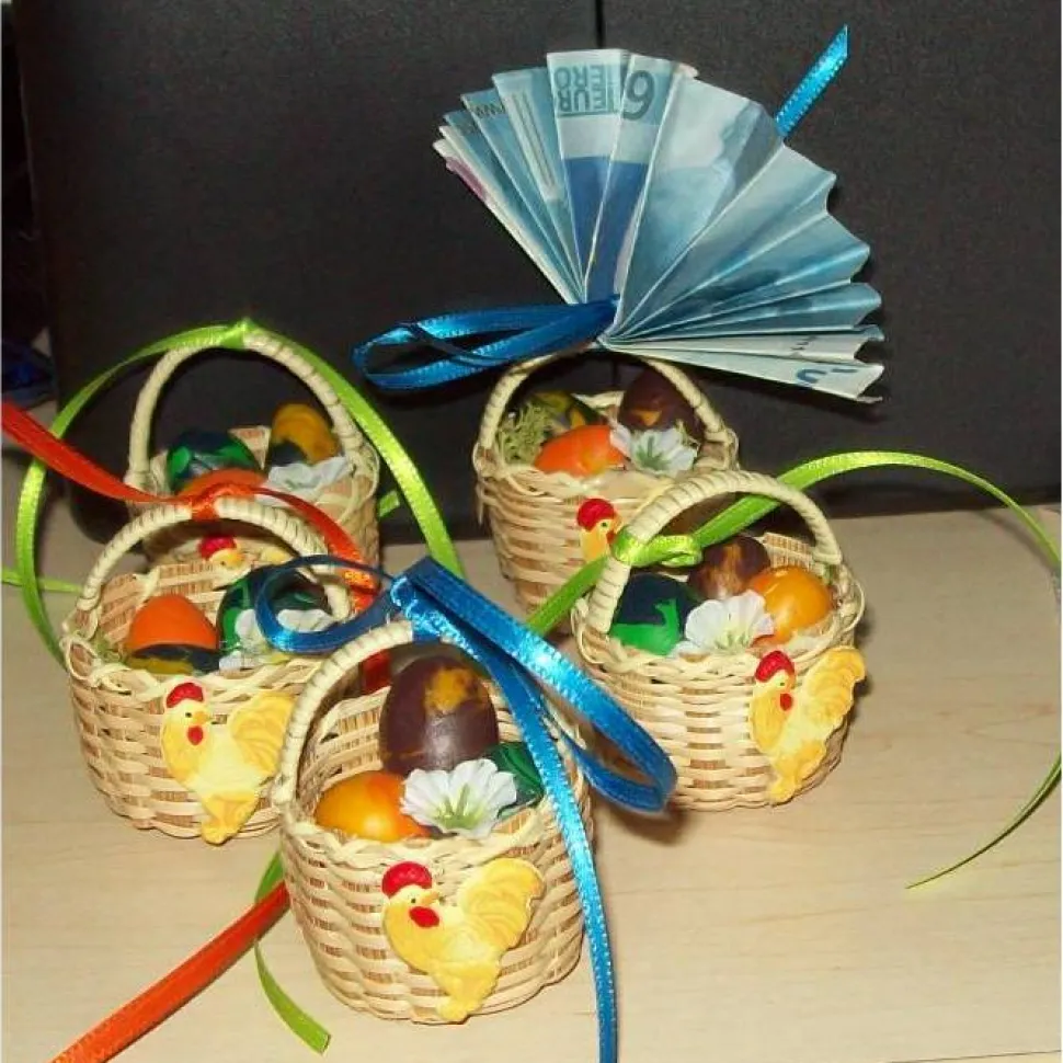 Gestalte dein Osterfest mit einem einzigartigen Osterkorb! Dieser handgefertigte Osterkorb ist perfekt als Geldgeschenk oder als liebevolle Osterdeko für deinen Osterstrauß. Jedes Körbchen wird mit viel Sorgfalt gebastelt: Aus Fimo geformte, marmorierte Ostereier werden gebacken und sorgfältig in ein mit Moos ausgelegtes Spankörbchen geklebt. Blüten und kleine Außendekorationen wie Hahn oder Hase sowie eine Schleife zum Aufhängen machen jedes Stück individuell.