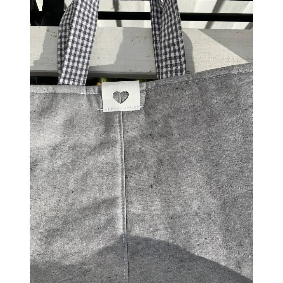 Die Tasche wurde von mir aus hochwertigem Baumwollstoff mit Digitaldruck in Betonoptik genäht, die Innenseite und Tragegriffe aus mittelgrauem kariertem Webstoff.
