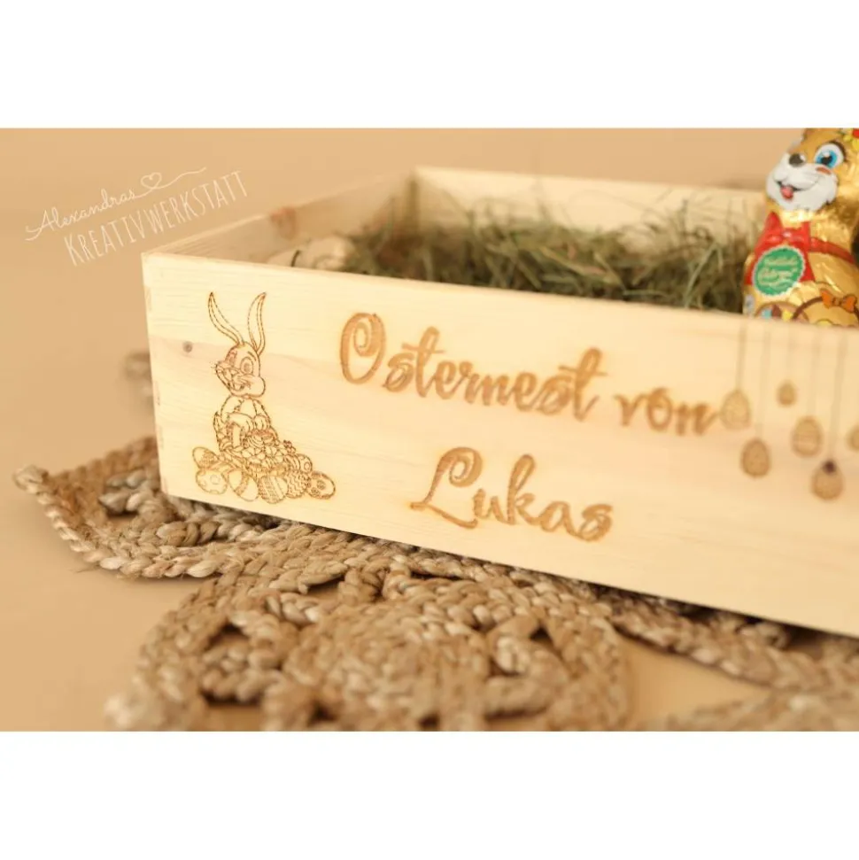 Lieferumpfang: einseitig Gravierte Holzkiste mit oder ohne Heu/Gras.