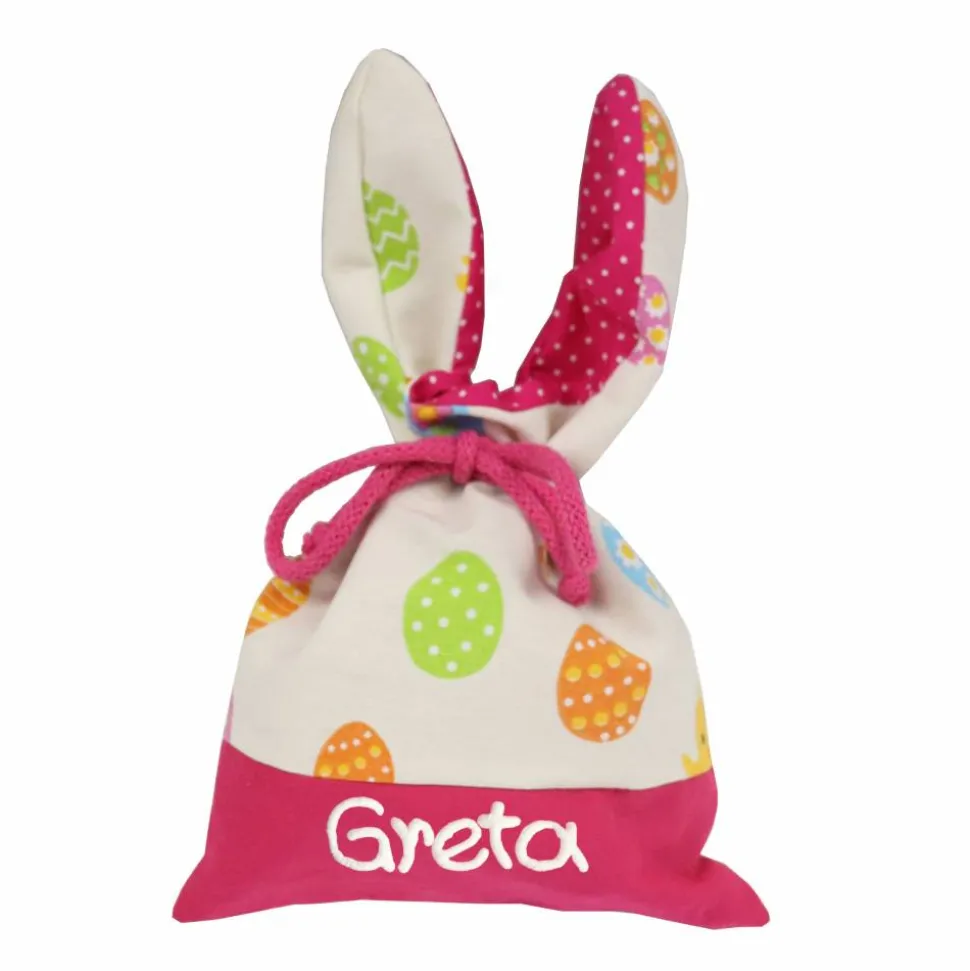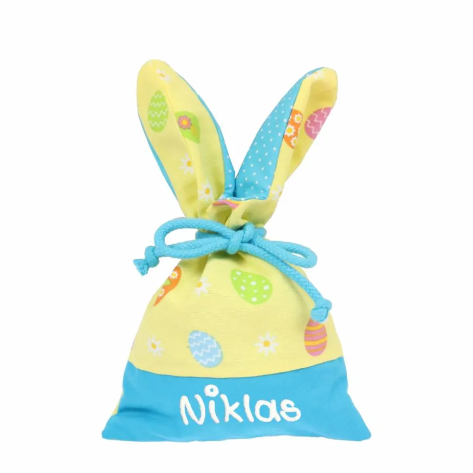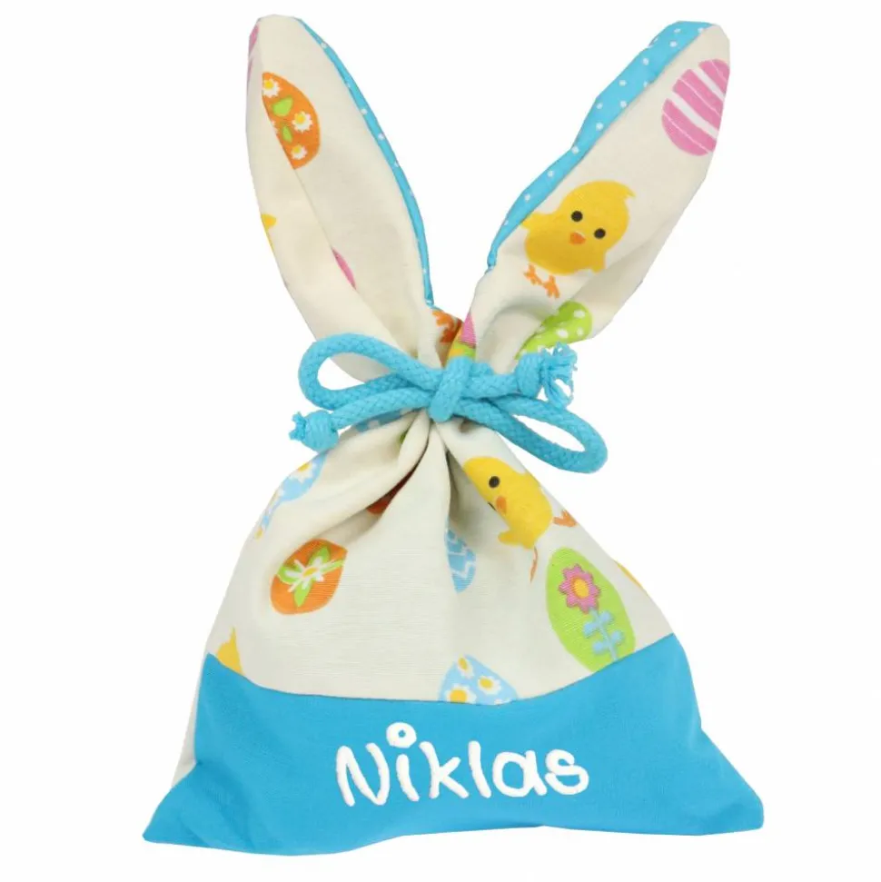 Es muss nicht immer das Osternest sein. Kinder freuen sich auch über einen Säckchen mit lustigen Hasenohren. Fülle es mit Schokoladeneiern und verstecke es. Durch die Beschriftung mit Name kann es nicht verwechselt werden.