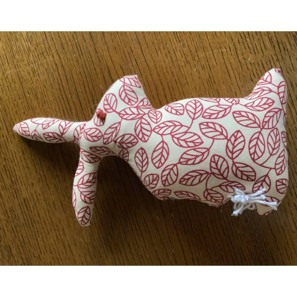 Baumwollstoffe mit gleichem Blattmuster auf rotem oder cremefarbenem Grund (vorgewaschen), Stickgarn, weiße und rotbraune Wolle (Mischgewebe), Filz, Deko-Bändchen in rot, braune und weiße Knöpfe, Bastelwatte als Füllwatte (Recycling-Material).