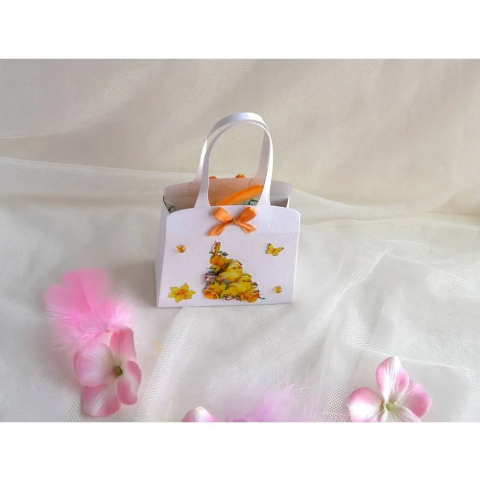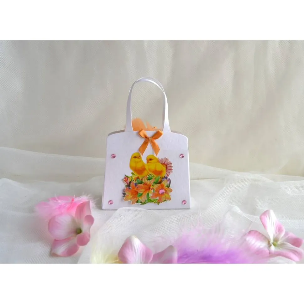Diese wunderschöne kleine Geschenktasche ist für Geschenke vom Osterhasen (Geld, Gutschein oder Süßes) bestens geeignet. Liebevoll in Handarbeit hergestellt. Diese süße Ostertasche wird mit Ostergras und einer farblich passenden Feder geliefert. Die Schokoeier sind nicht im Lieferumfang enthalten. Die Geschenktasche ist auf beiden Seiten mit unterschiedlichen 3D Motiven sowie mit einer Stoffschleife verziert.