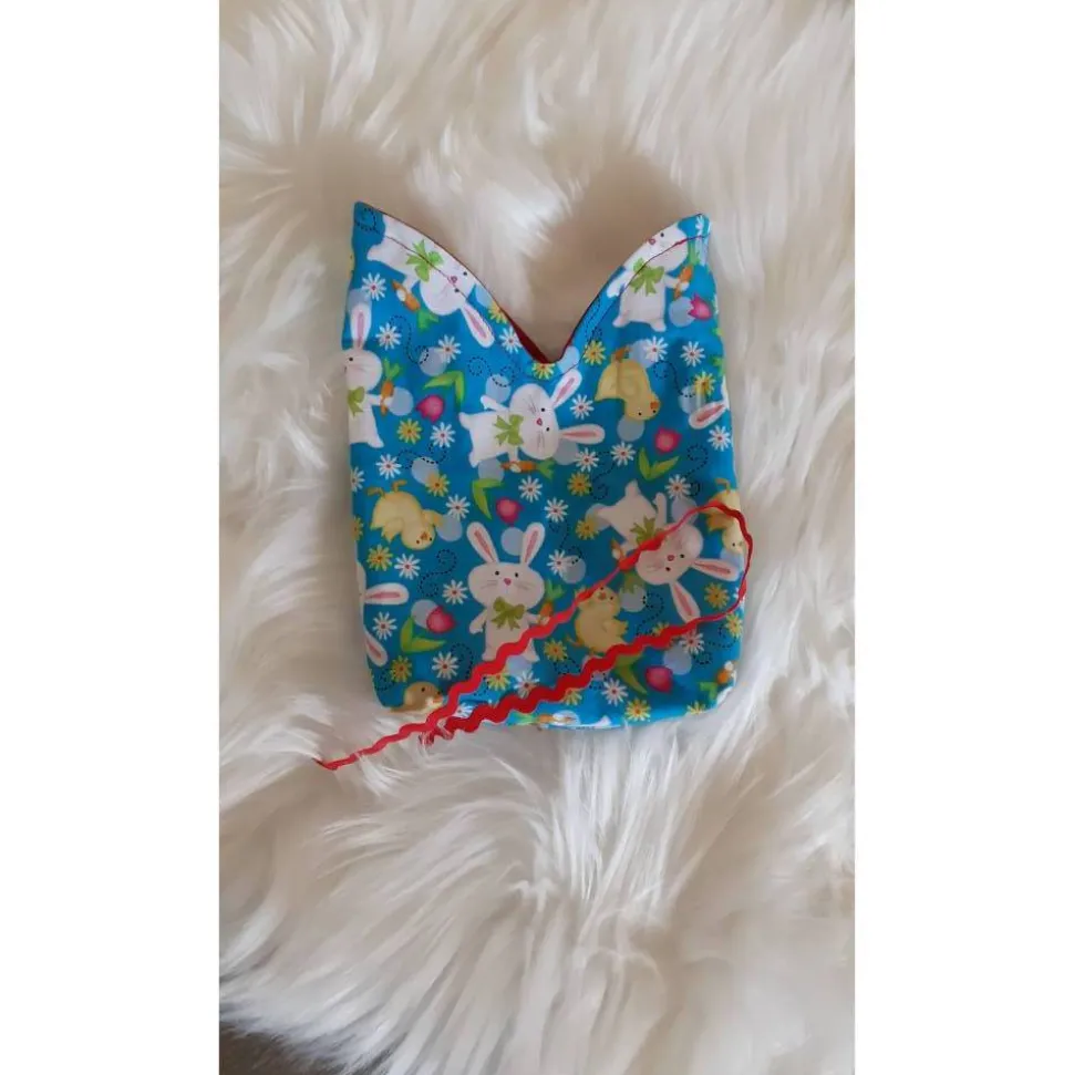 Der Außenstoff ist in der Grundfarbe blau und mit weißen Hasen, Küken und Blumen bedruckt und innen ist ein uni rötlicher Stoff verarbeitet