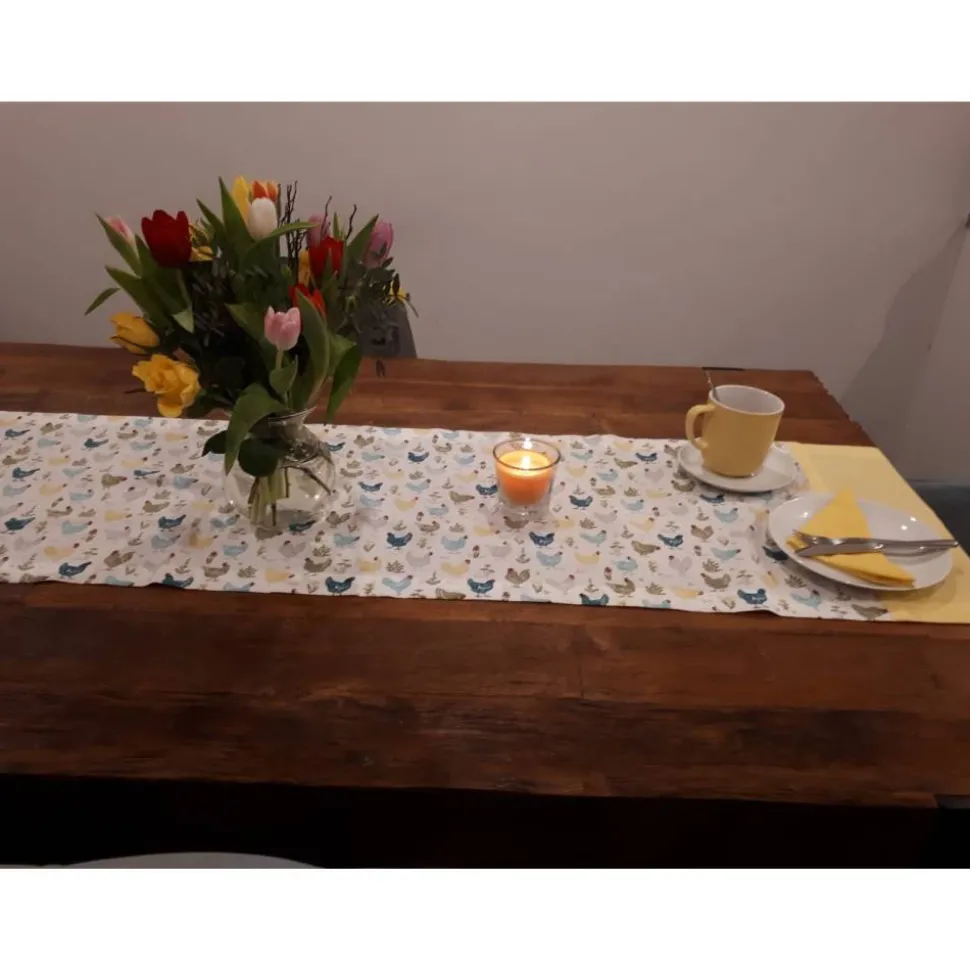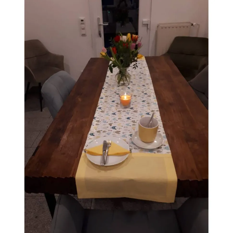 Frühling und Gemütlichkeit vermittelt dieser tolle Stoff. Ob für den Gartentisch, Esstisch oder Wohnzimmertisch: diese Tischdecke ist ein echter Hingucker. Machbar ist die Tischdecke und der Läufer in verschiedenen Größen und Formen. So kann der Läufer z.B. mit einer Spitze oder gerade genäht werden. Passend dazu gibt es auch Platzsets.