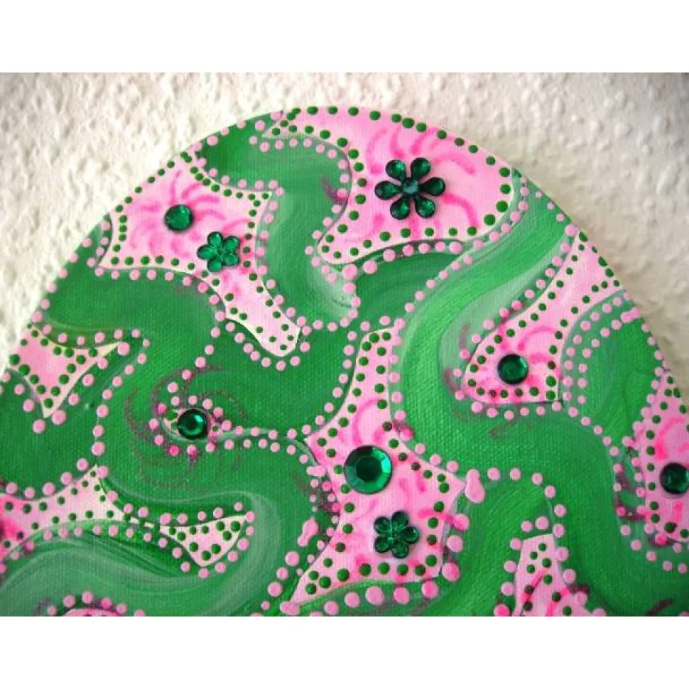 Acrylfarben und Glitzersteinchen, mit viel Glitter, abstrakt gestaltet auf einem ovalen Keilrahmen.