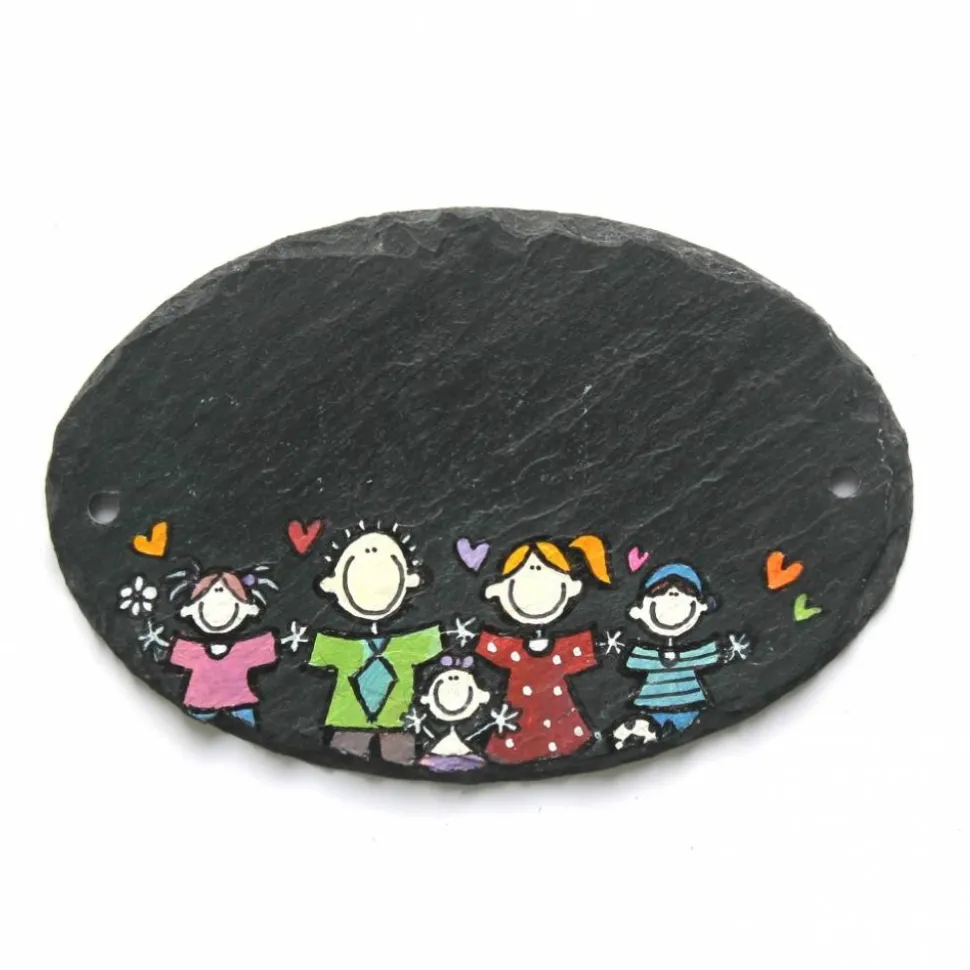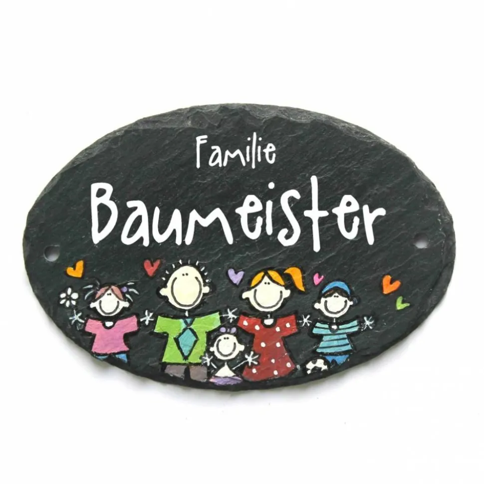 Verleihe deinem Eingangsbereich eine persönliche Note mit einem ovalem Türschild aus hochwertigem Schiefer, das individuell mit deinem Familiennamen und Figuren gestaltet wird. Jedes Schild ist handgefertigt und macht deinen Hauseingang zu einem echten Blickfang.