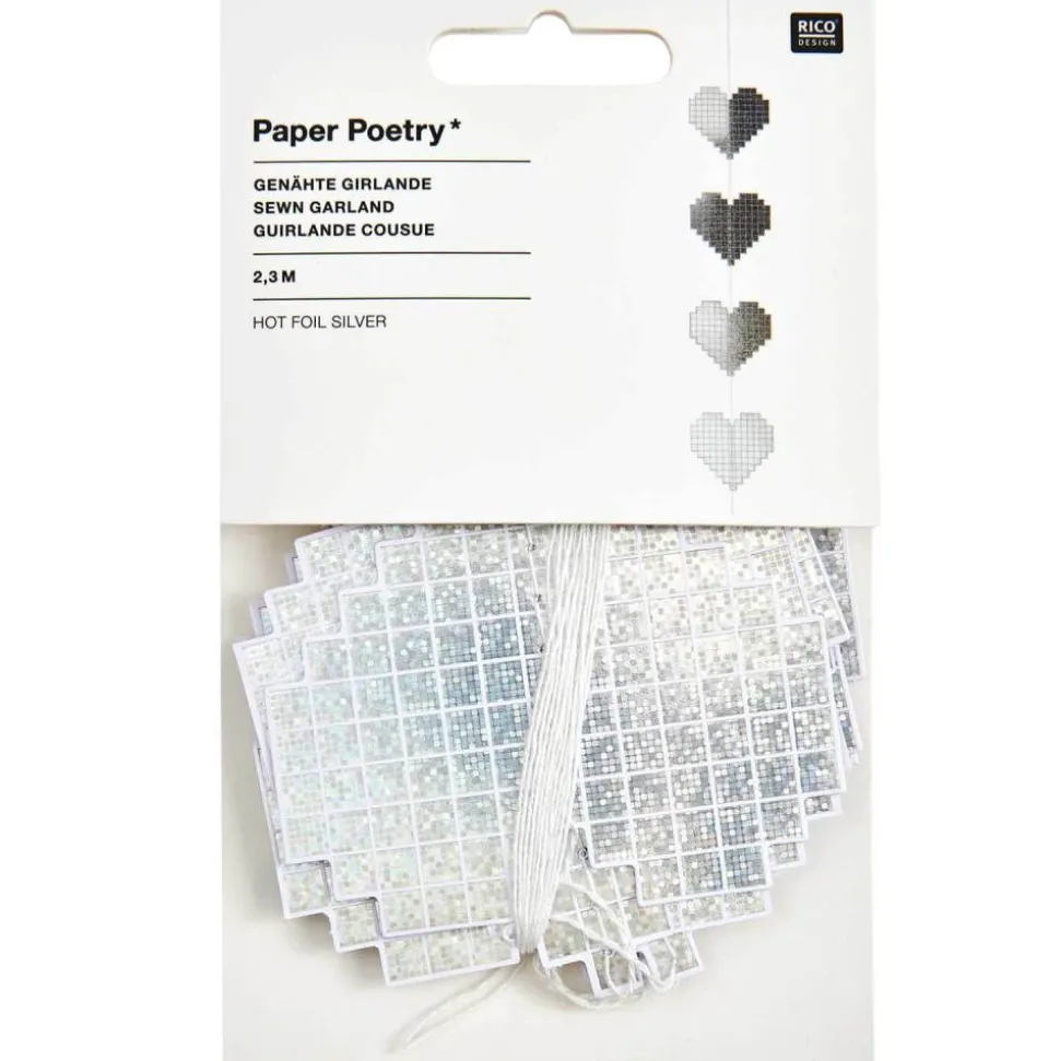 Die genähte Papiergirlande mit herzförmigem Design ist 2,3 Meter lang und bringt mit ihrer glänzenden Hot-Foil-Optik einen eleganten Touch in deine Dekoration. Die schimmernde Silberfarbe sorgt für ein edles Funkeln und setzt stilvolle Akzente auf jeder Feier.