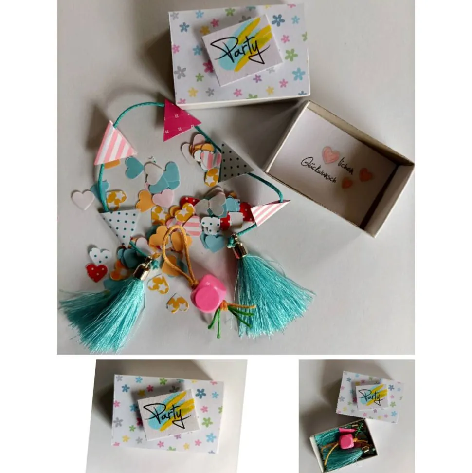In der Streichholzschachtel befindet sich eine Minigirlande mit Püschel an den Enden und einem Glücksbringer, abgerundet wird das ganze mit Konfetti in ausgestanzten Herzen, Kleeblättern und Sternen. Der Inhalt variiert in der Farbgebung und Glücksbringerform, ist aber immer geschmacklich aufeinander abgestimmt.