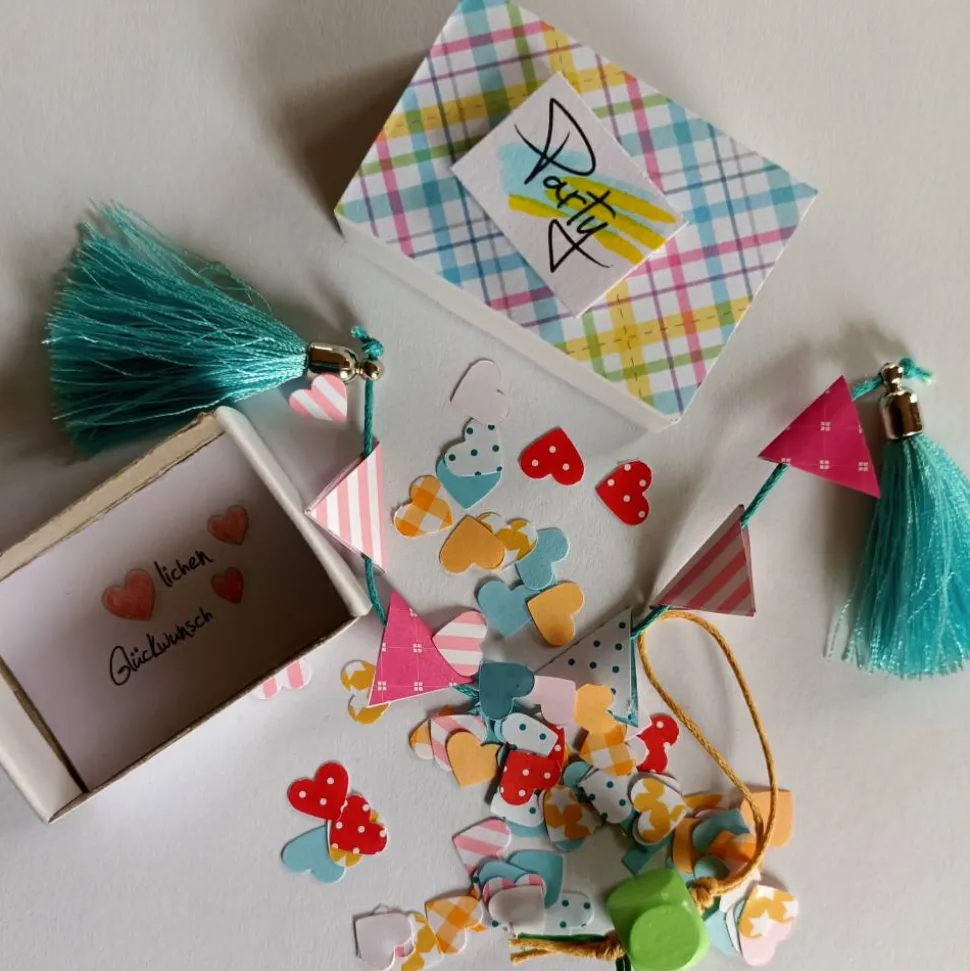 In der Streichholzschachtel befindet sich eine Minigirlande mit Püschel an den Enden und einem Glücksbringer, abgerundet wird das ganze mit Konfetti in ausgestanzten Herzen, Kleeblättern und Sternen. Der Inhalt variiert in der Farbgebung und in der Glücksbringerform, ist aber immer geschmacklich aufeinander abgestimmt.