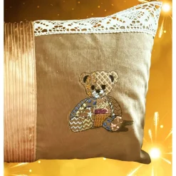 Dieses handgemachte Kissen bringt Teddy-Fans garantiert zum Strahlen! Auf der einen Seite ein glänzender Cordstoff, auf der anderen ein feiner brauner Cordstoff mit aufgesticktem Teddy im Patchwork-Stile – ein echtes Highlight!