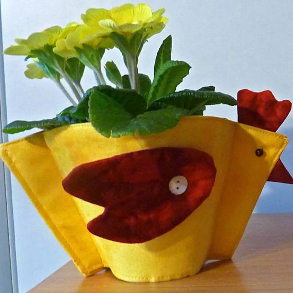 Das Übertopf-Huhn ist aus hochwertigen amerikanischen Patchworkstoffen mit der Maschine genäht. Die Flügel sind liebevoll von Hand gequiltet und mit Perlmuttknöpfen angenäht. Die Augen sind ebenfalls von Hand angenäht.