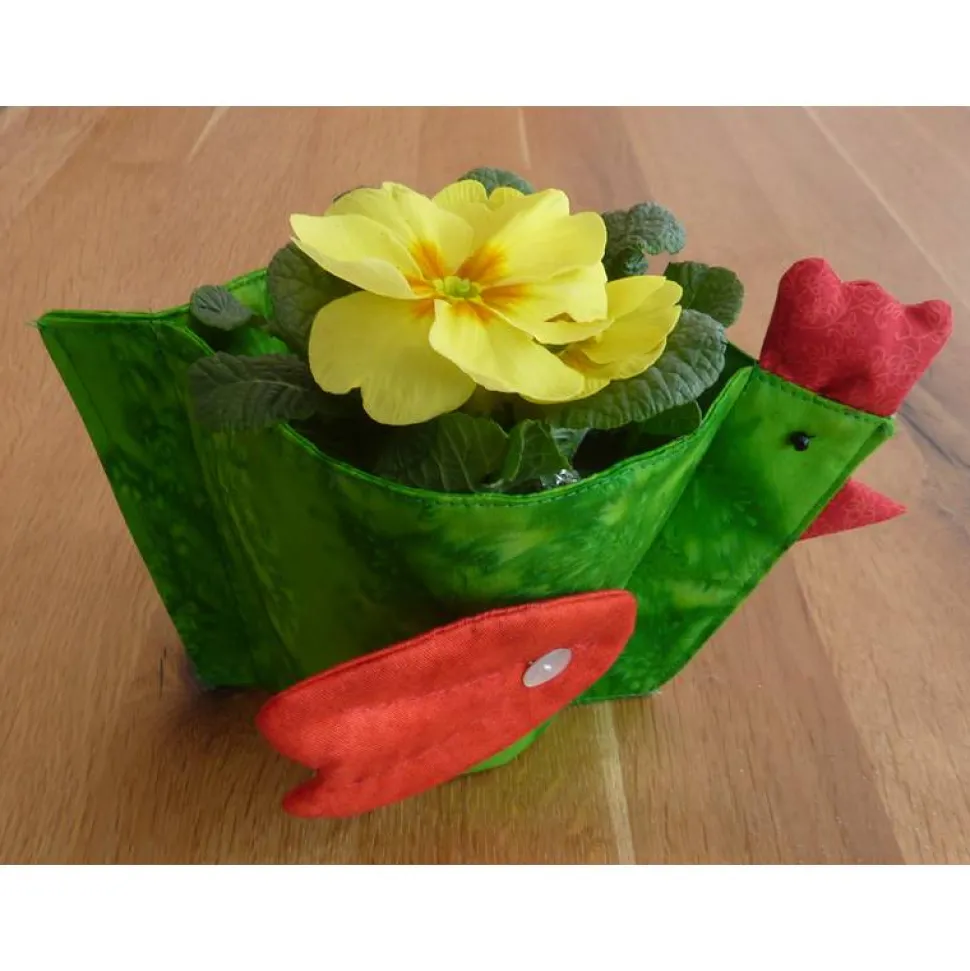 Das Überhopf-Huhn ist ca. 25 cm breit und ca. 14 cm hoch. Ein kleiner Blumentopf mit ca. 10 cm Durchmesser passt wunderbar in das Huhn. Also genau richtig für die ersten Primelstöckchen und Frühlingsboten.