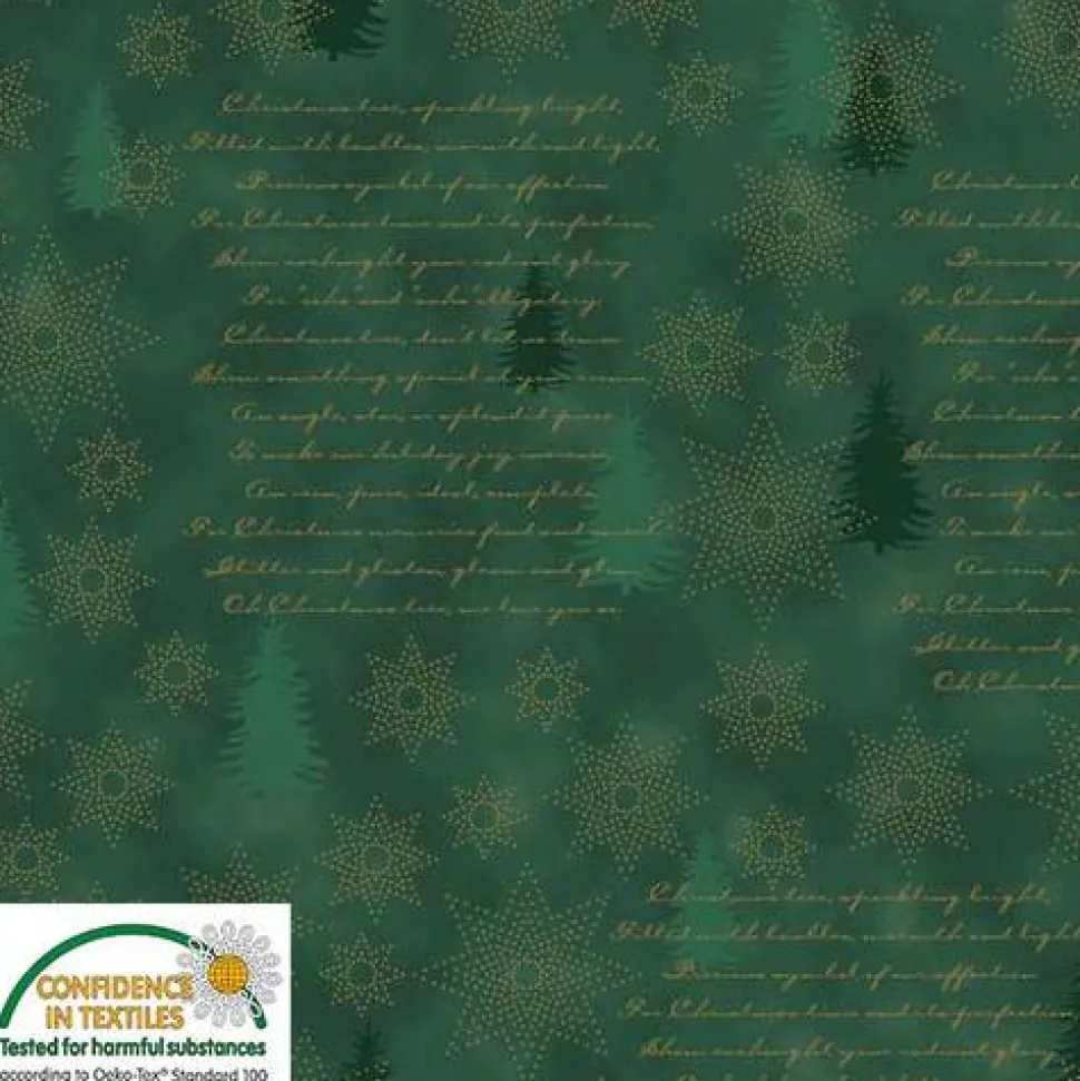 Patchworkstoff von Stof A/S – Star Springle in der Farbe grün mit goldenen Sternen, dunklere Tannenbäume und goldener Schrift.