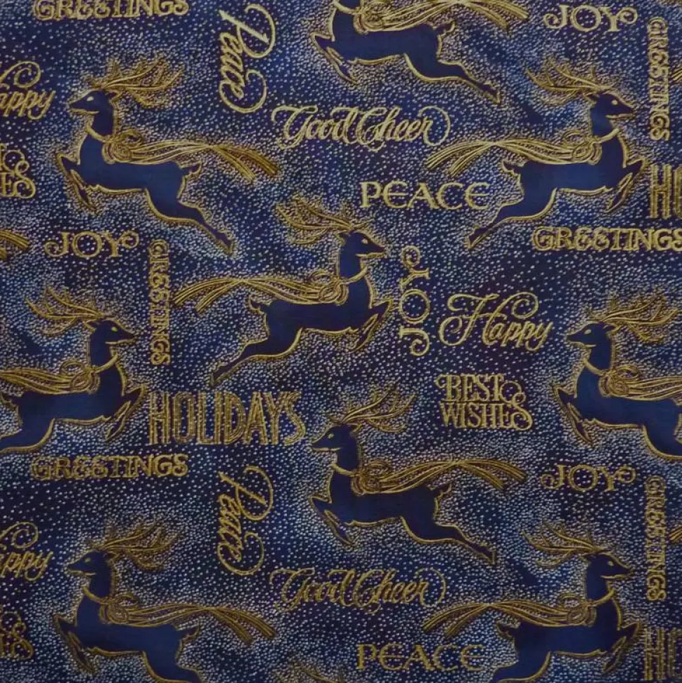 Was für ein edler, opulenter Weihnachtsstoff. Wer die Hoffman-Kollektion kennt, weiß wie edel und hochwertig diese Stoffe sind. Dieser Stoff ist sehr ausdrucksstark mit den großen Schriftzügen und Rentieren. Er wirkt am schönsten, wenn er großflächig verarbeitet wird. Die Rentiere sind bis zu 9 cm lang, die verschiedenen Schriftzüge bis zu 8 cm.