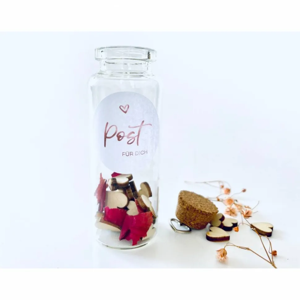 Sie ist aus Glas und hat einen Korkverschluss in dem ein kleiner Herzanhänger steckt.