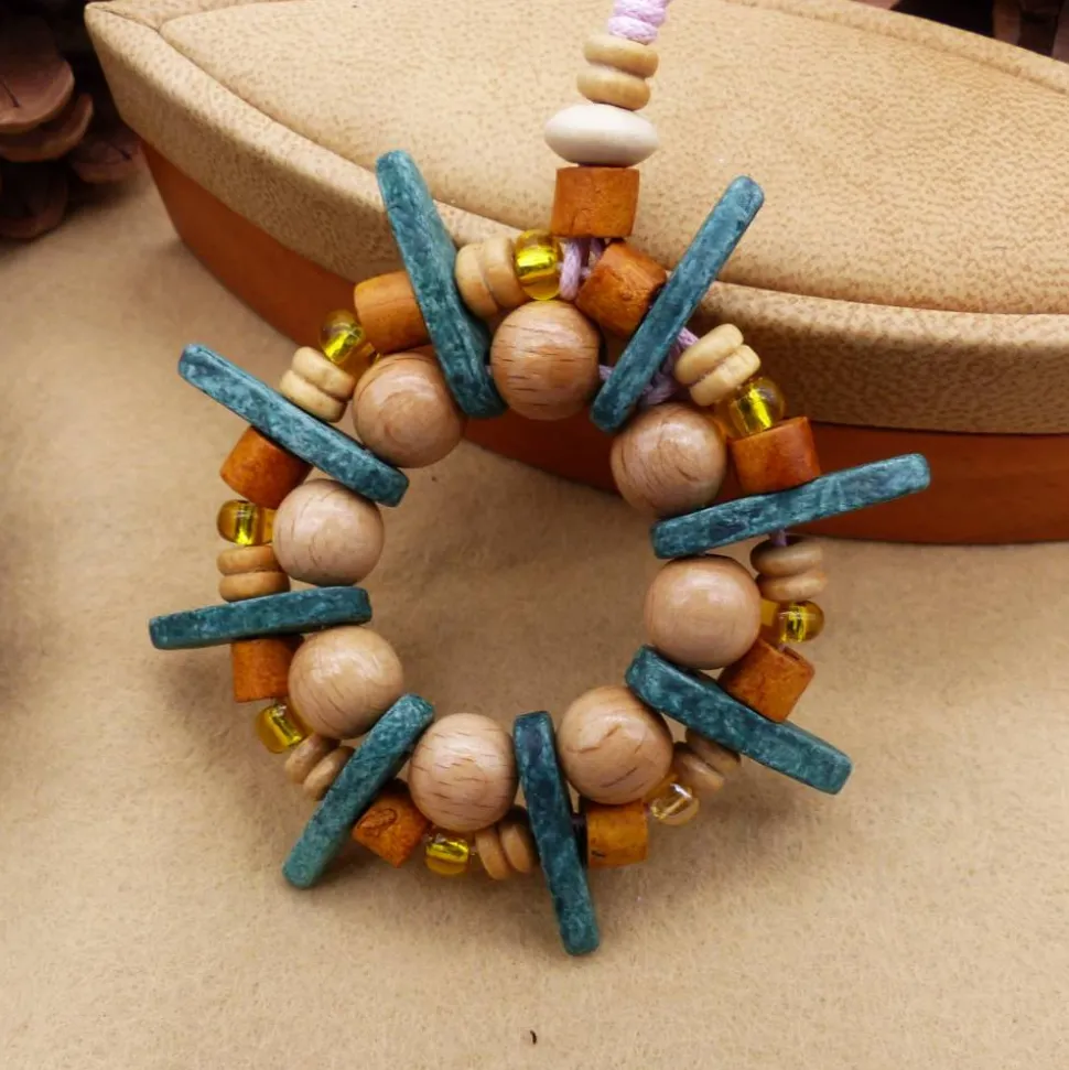 Die Spitzen der Sterne sind griechische Keramikperlen. Die Ringe sind aus Holz und dazwischen kleine Glasperlen.