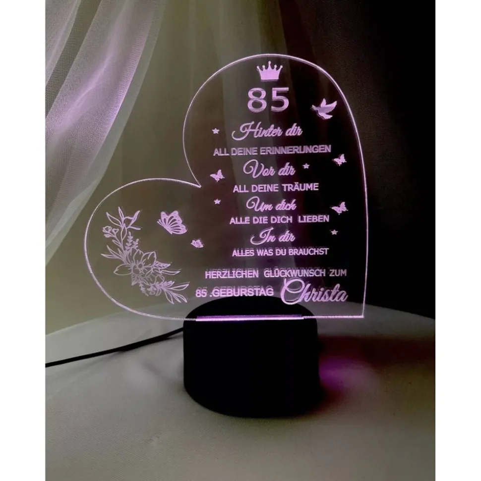 ist das perfekte Geschenk für Freunde und Familie. Die moderne 3D-Lampe wird mit einem Holz-Sockel geliefert und ist mit einer warmweißen LED-Beleuchtung ausgestattet. Sie ist aus Acryl gefertigt und kann über eine USB-Stromversorgung betrieben werden. Besonders schön ist die Gravur, die nach Wunsch mit einem individuellen Namen oder Spruch personalisiert werden kann. Die Herzlampe eignet sich für alle Zimmer und ist ein Blickfang im Wohnzimmer, Schlafzimmer oder auch im Arbeitszimmer.